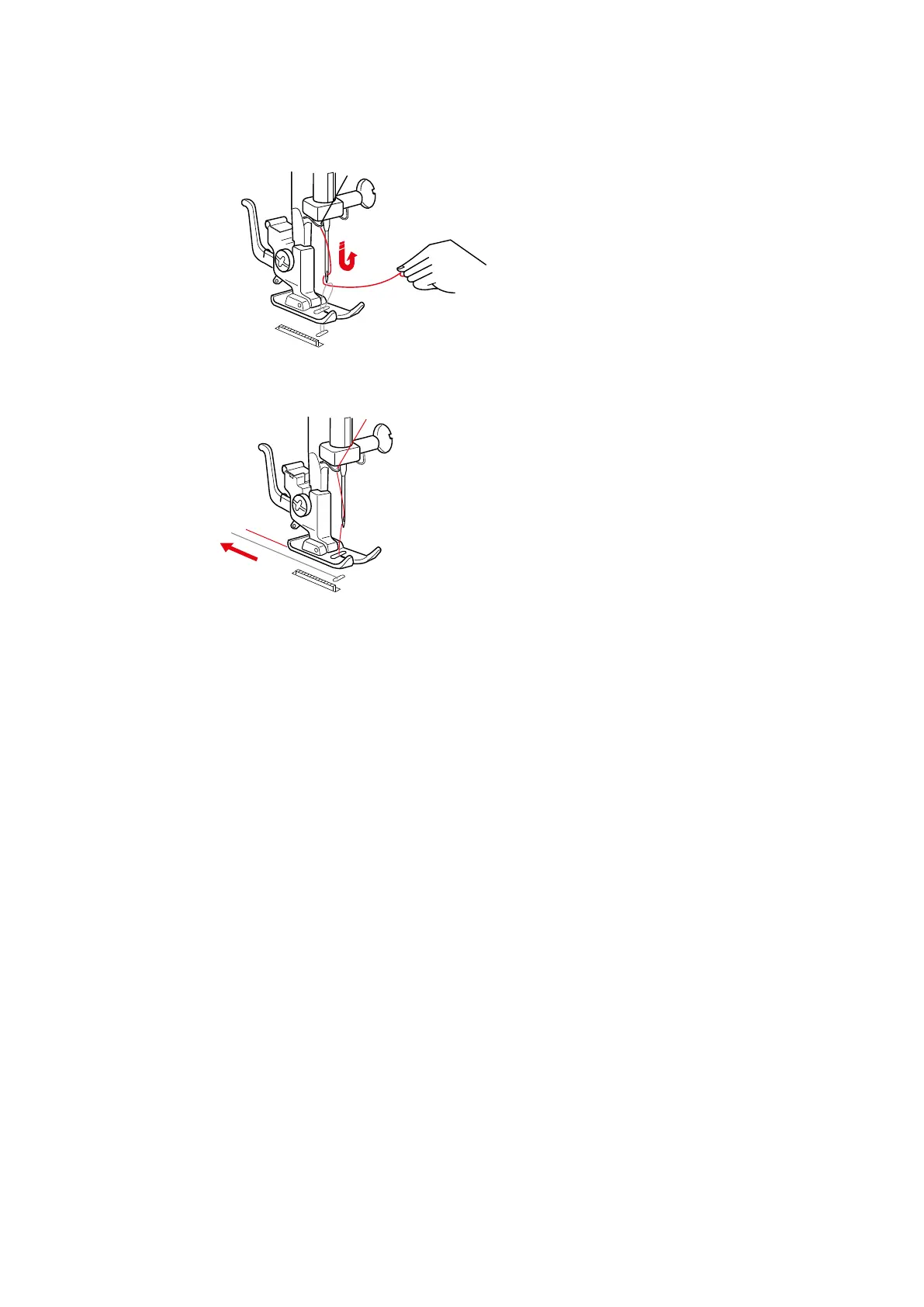> Pull 10cm (4") of both threads back and under the presser foot.