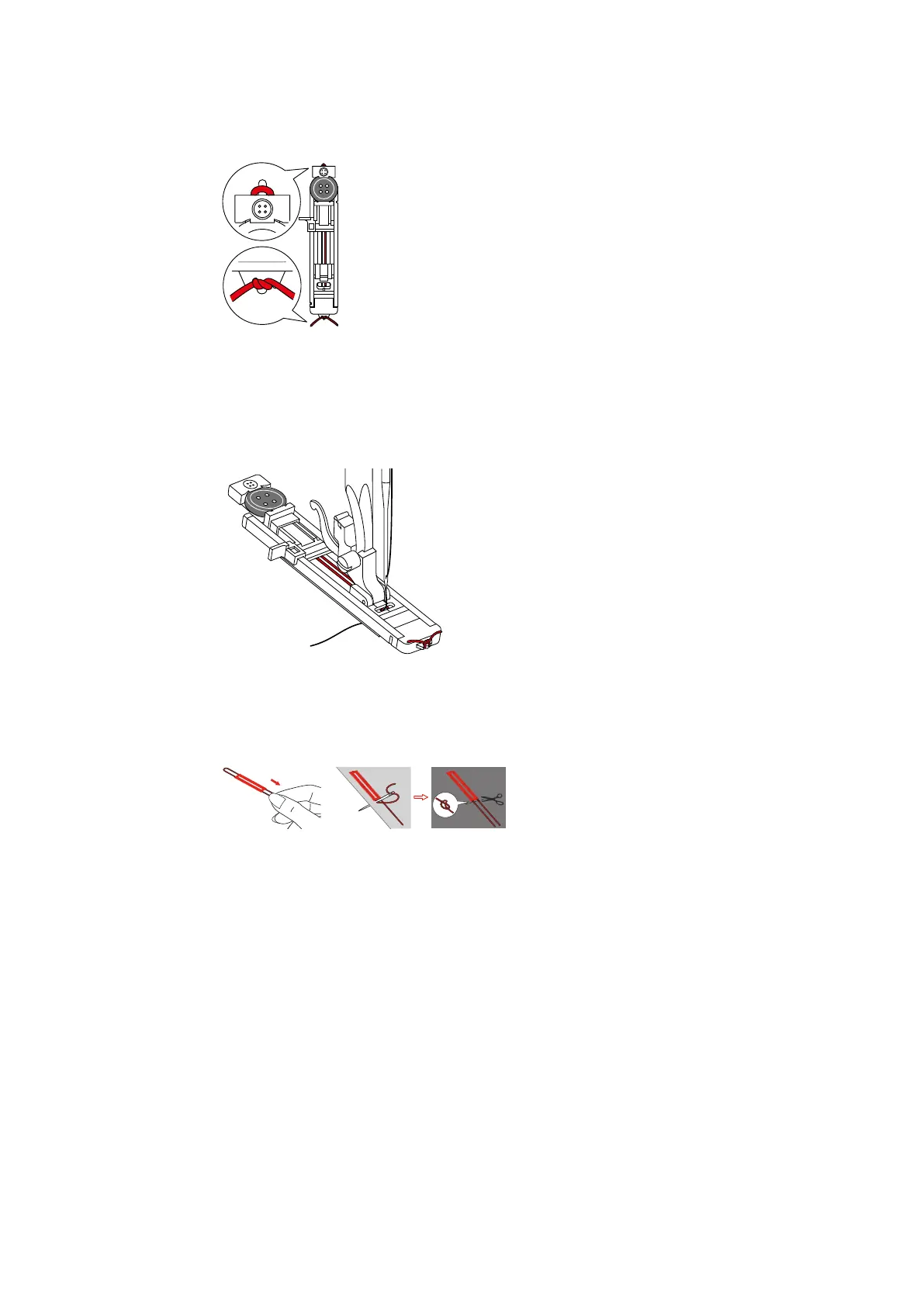 > Hook both ends of the thread on the front of the presser foot, guide them into the groove and tie them