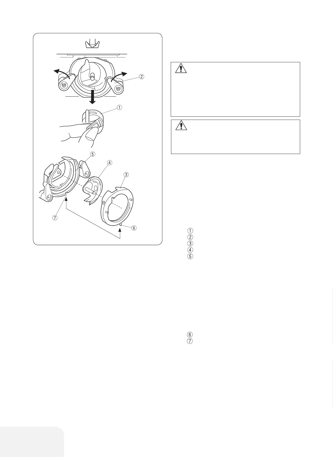 Open the hinged latch of bobbin case and take it out of