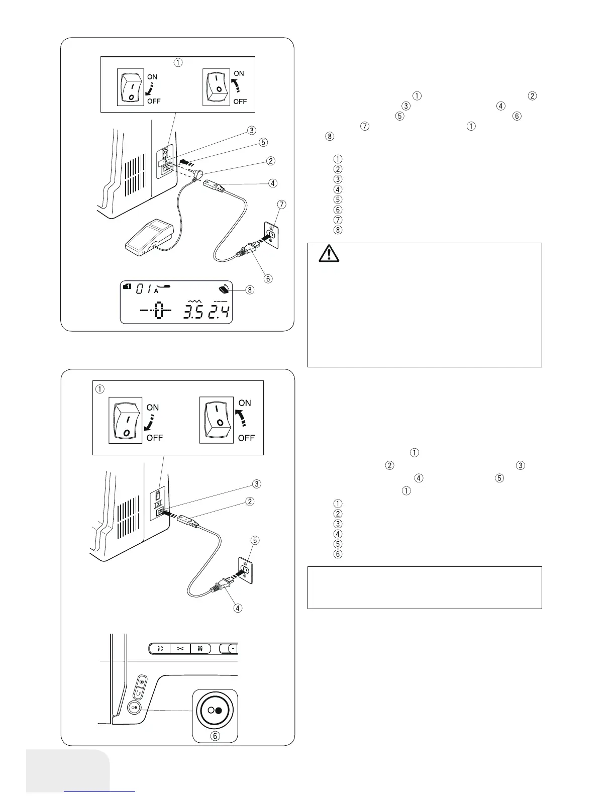 Switch off the power switch . Insert the foot control plug