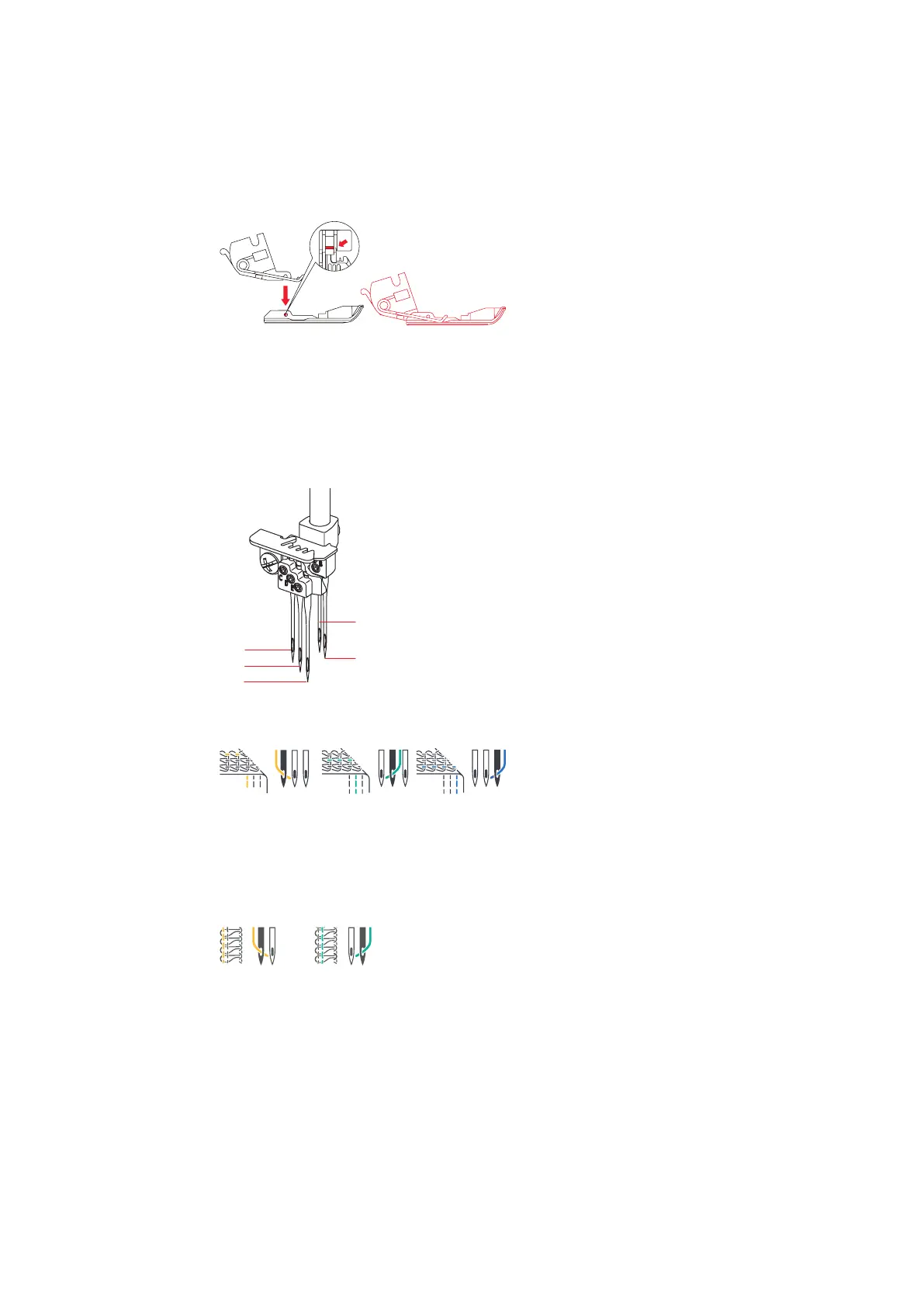 The needle holder can hold five needles. The machine is designed for needles of the ELx705 system. Needle