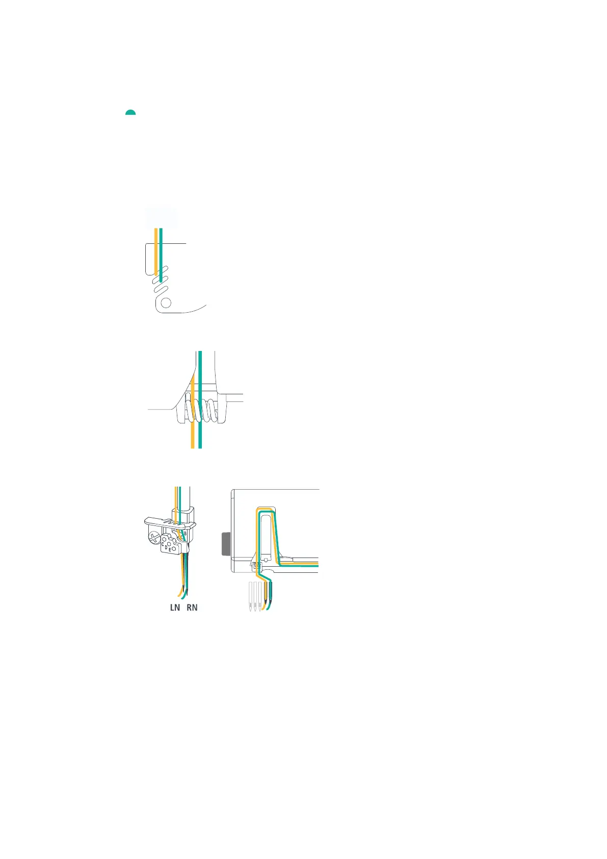 > Place the thread along the colored marking, then over the needle thread take-up cover and pull it