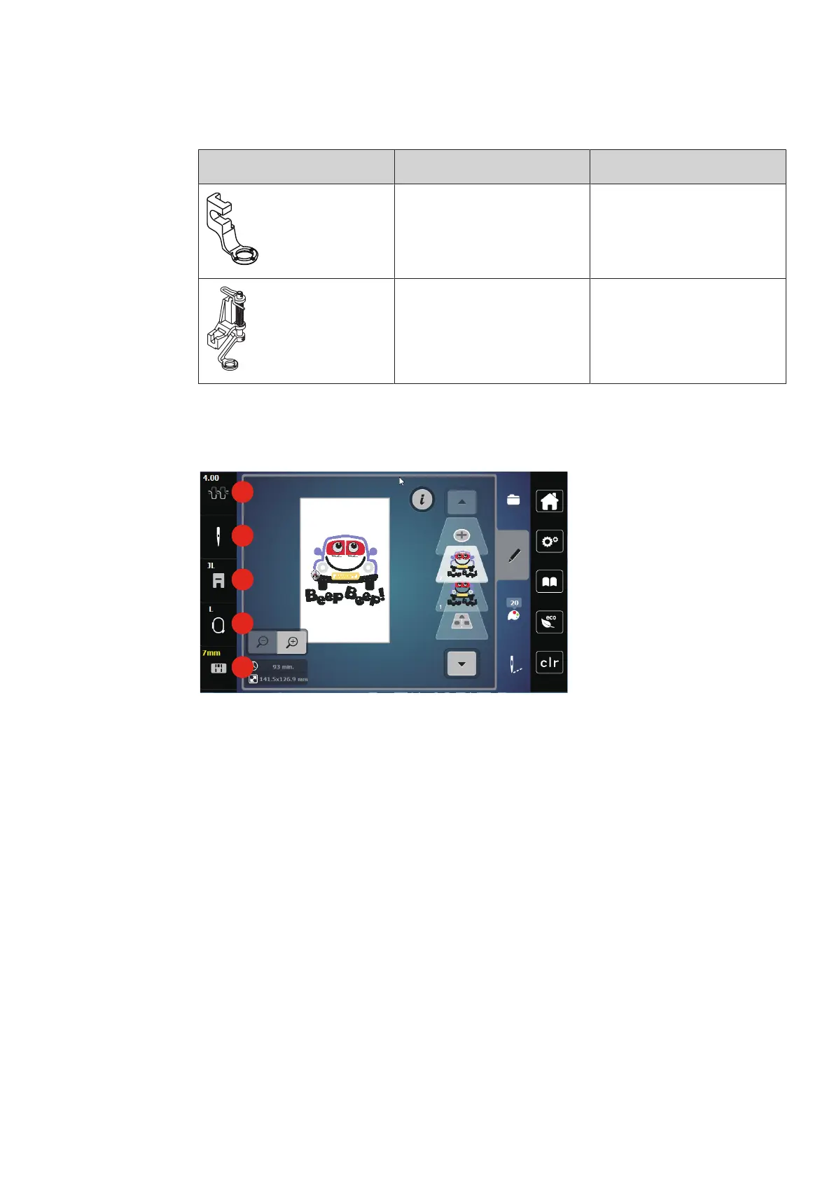 1 Upper thread tension 4 Embroidery hoop display/Embroidery hoop