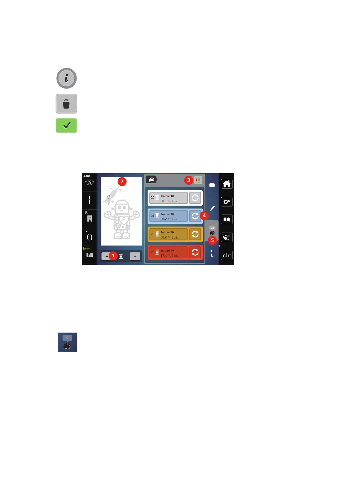 – Touch the icon «Scrolling» (6) in the top right portion of the display to display other thread brands.