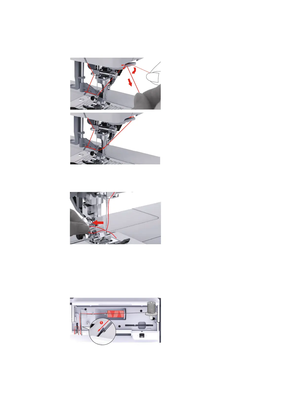 > Guide the first and the second thread to the thread guide above the needle.