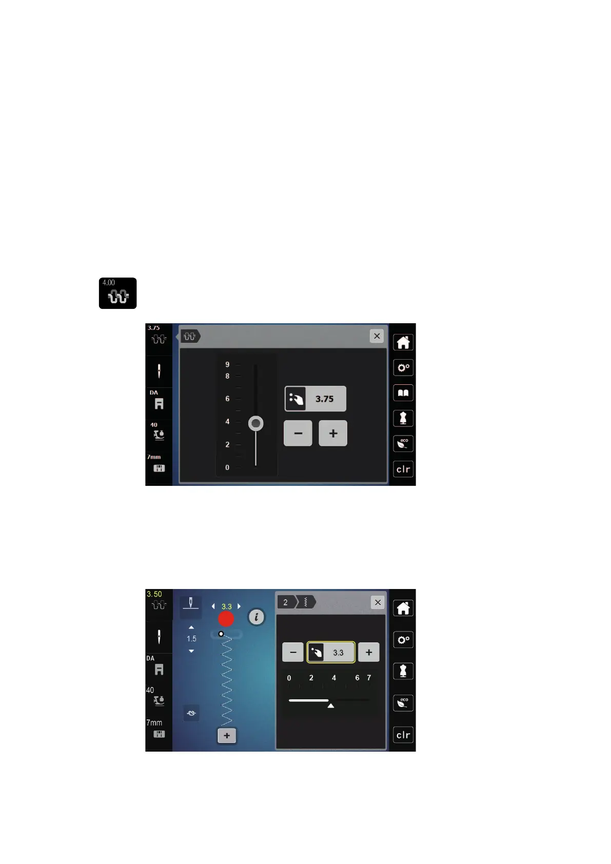 > To call up further setting options, touch the icon «Stitch width» (1).