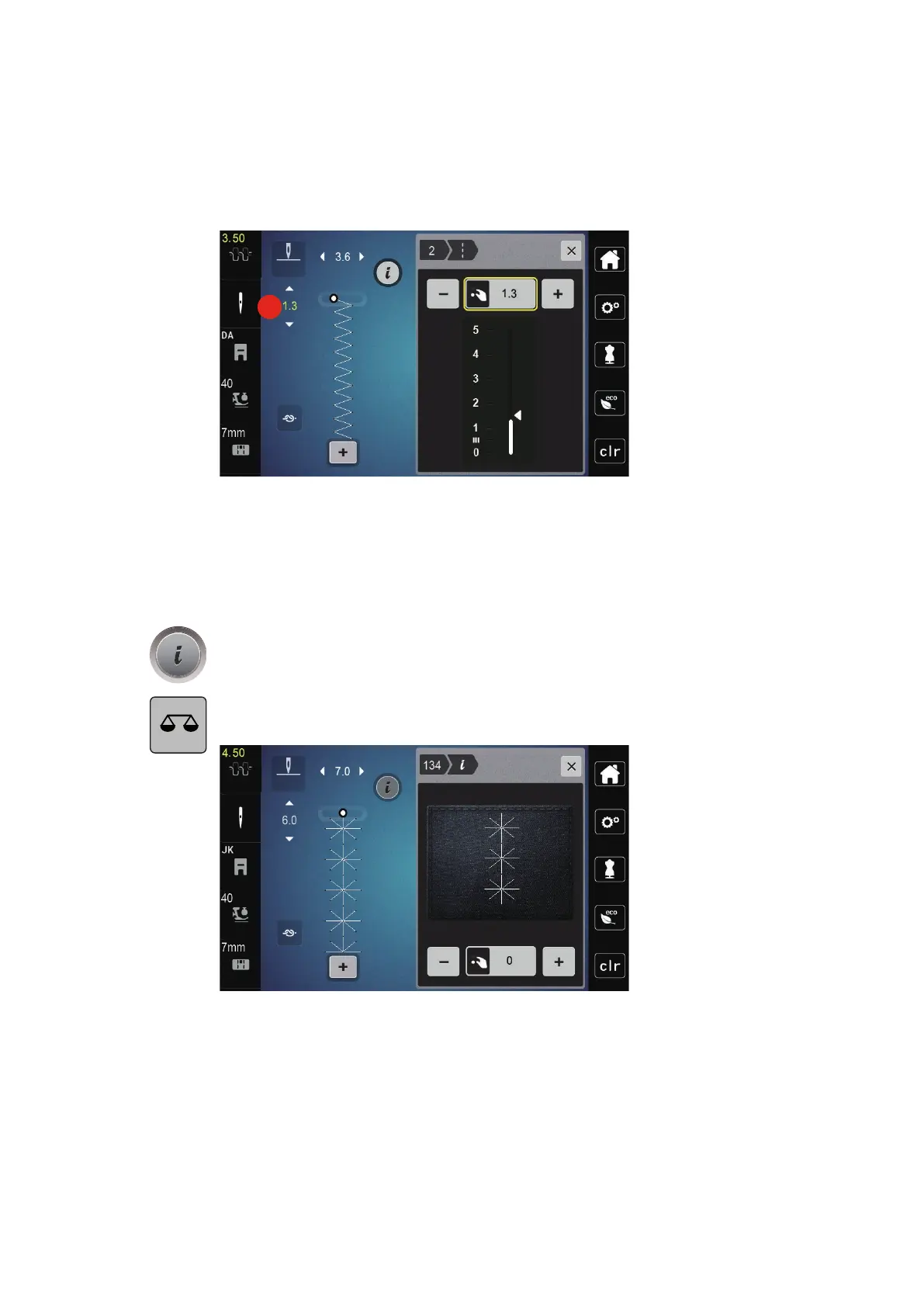 > To call up further setting options, touch the icon «Stitch length» (1).