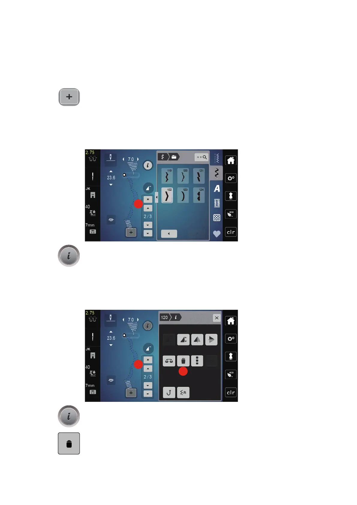 > Touch the icon «Delete» to delete the individual stitch pattern.