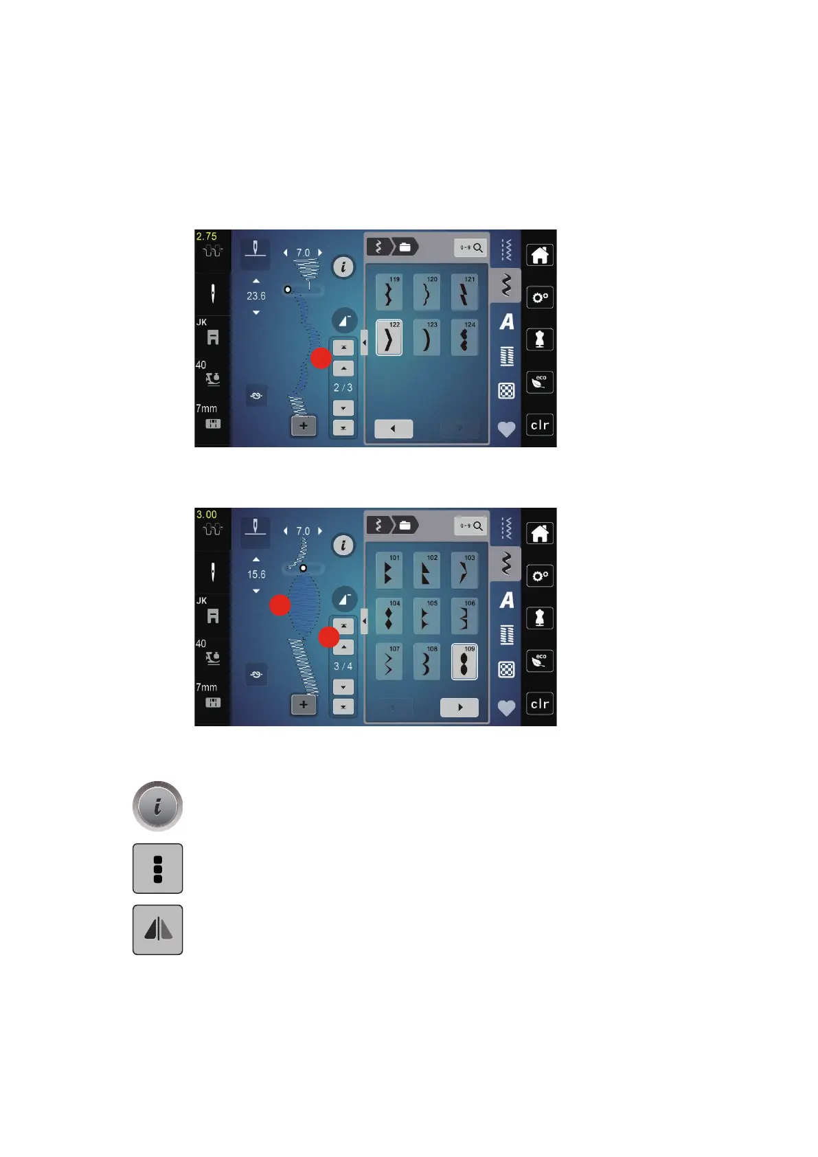 > Touch the icon «Mirror image left/right» to mirror the whole stitch pattern combination from the left to