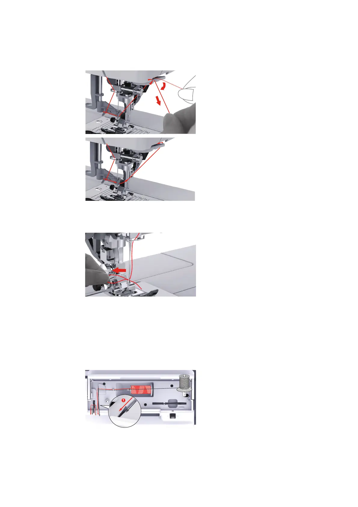 > Guide the thread from the horizontal spool pin (red) in the direction of the arrow to the left side of the