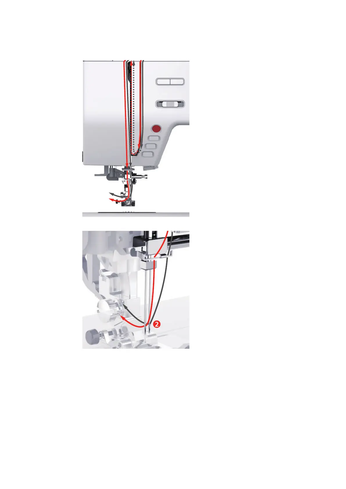 > Guide the thread from the vertical spool pin (blue) in the direction of the arrow to the right side of the