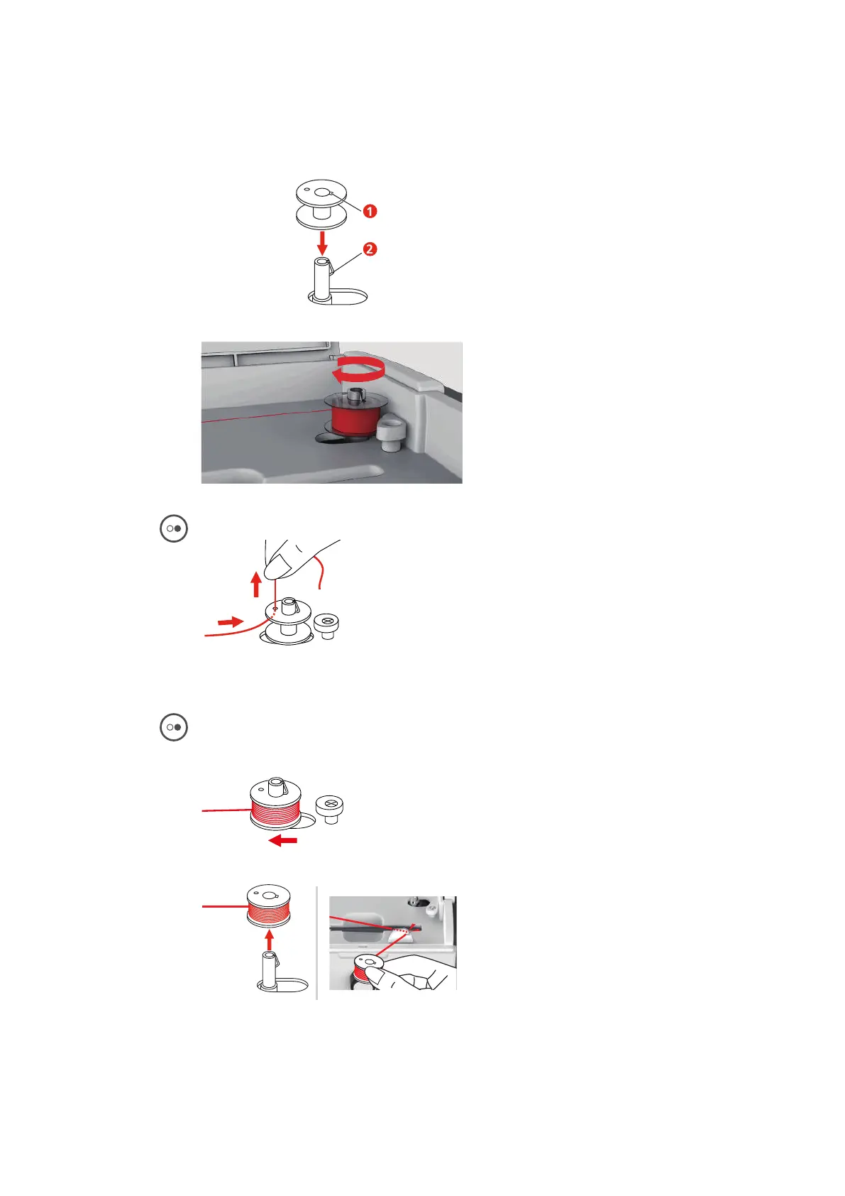 > Pull the end of the thread through one of the inner holes on the bobbin and place the empty bobbin on