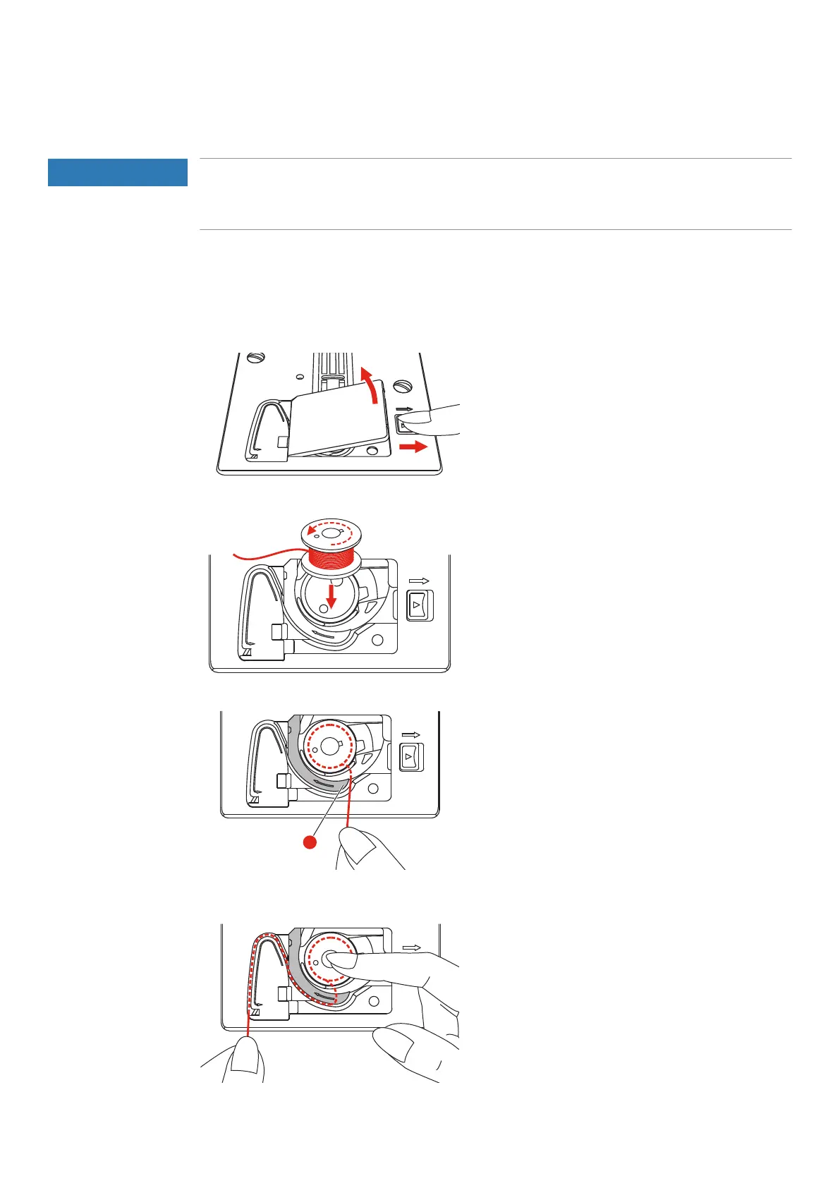 > Follow the arrow markings to bring the thread into the bobbin thread guide.