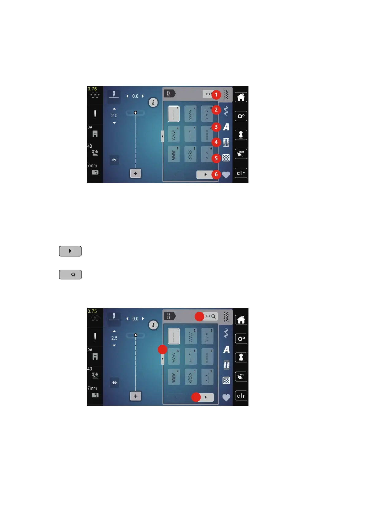 > To minimize the stitch pattern view, tap «Increasing/Decreasing the Display Size» (2) again.