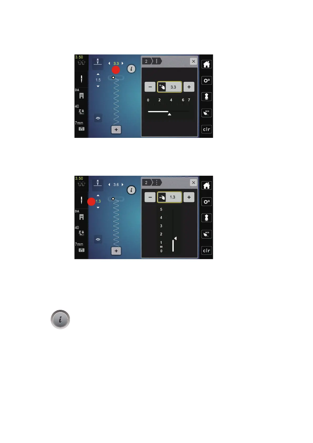 > To call up further setting options, tap the icon «Stitch width» (1).
