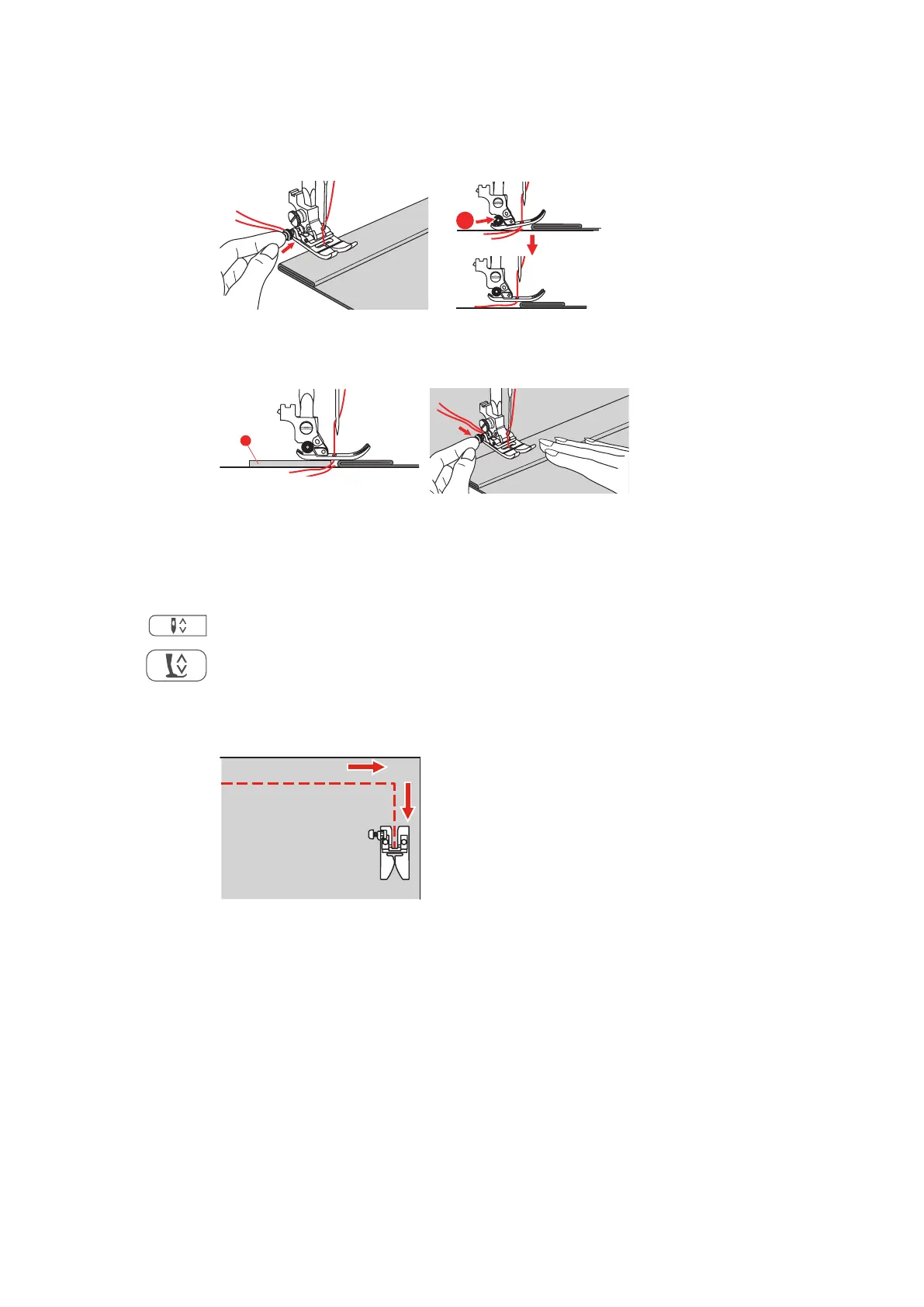 > Press the foot tip and the black knob, lower the presser foot and continue sewing.