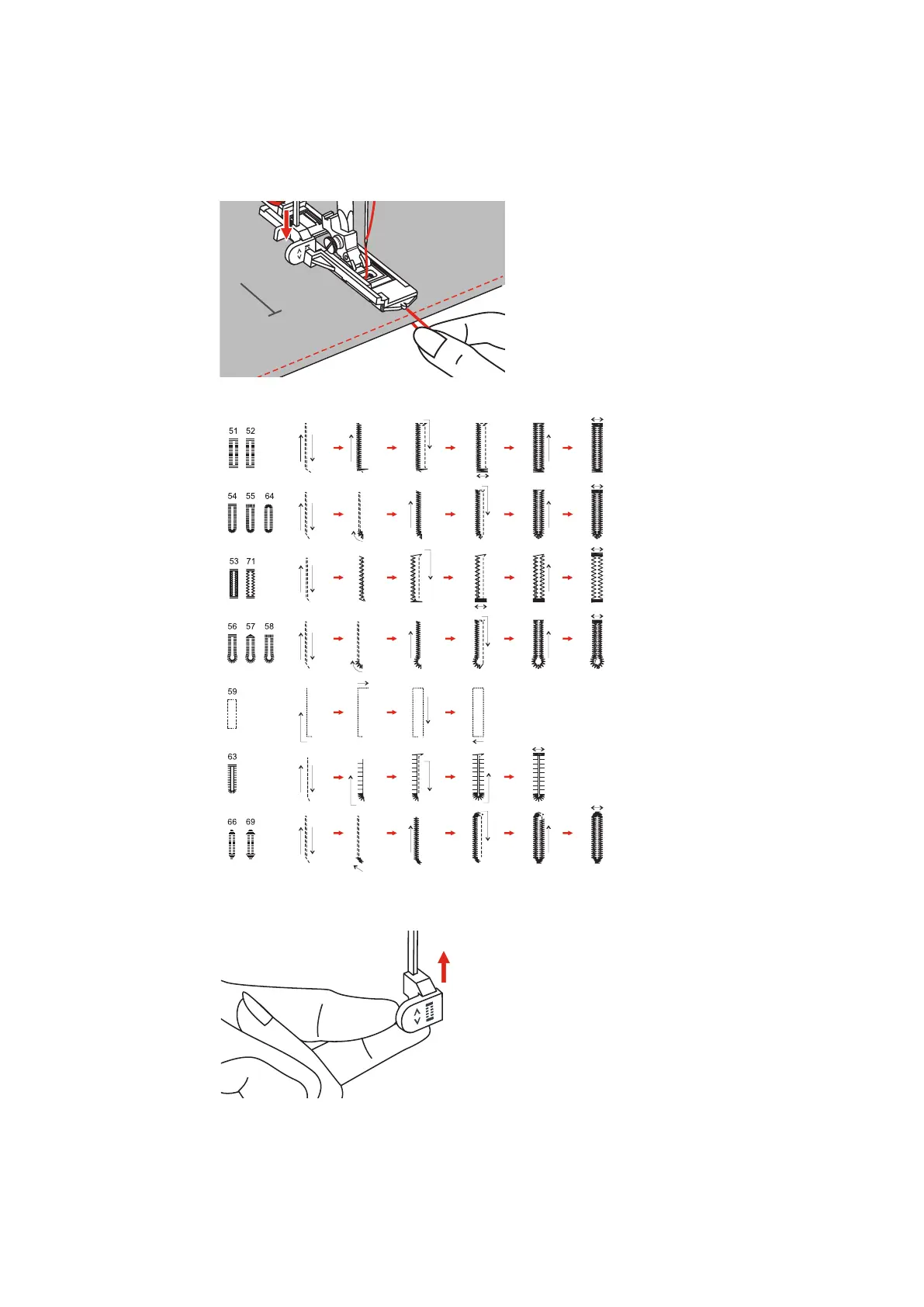 > Hold the upper thread vertically to the buttonhole foot with slide and start sewing.