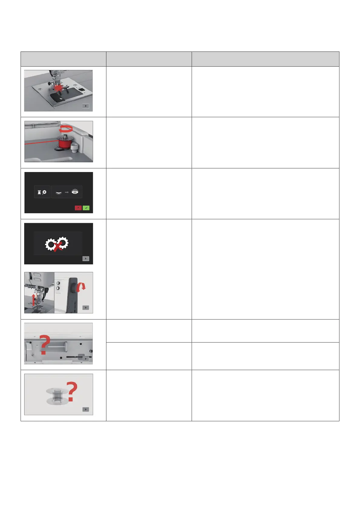 The bobbin thread is used up. > Remove the empty bobbin, wind it again and reinsert it.