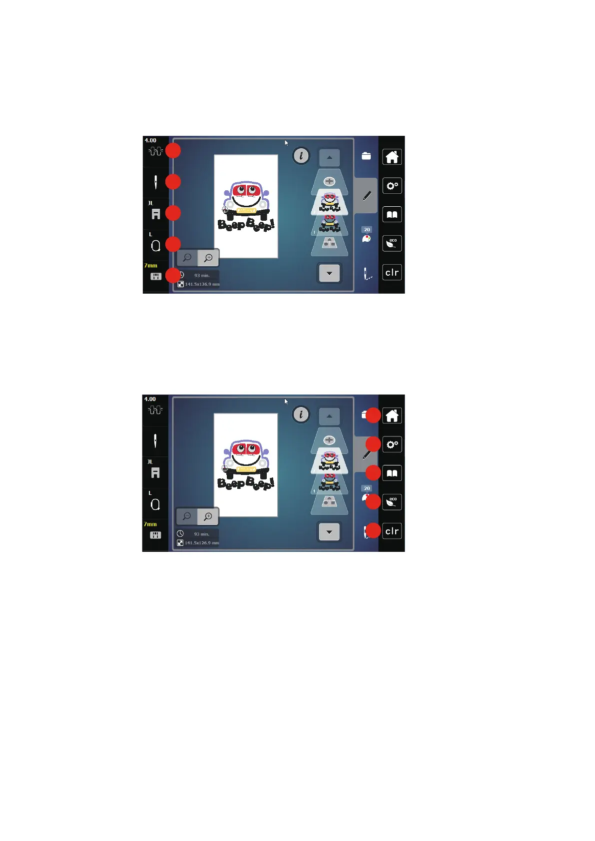 1 Upper thread tension 4 Embroidery hoop display/Embroidery hoop