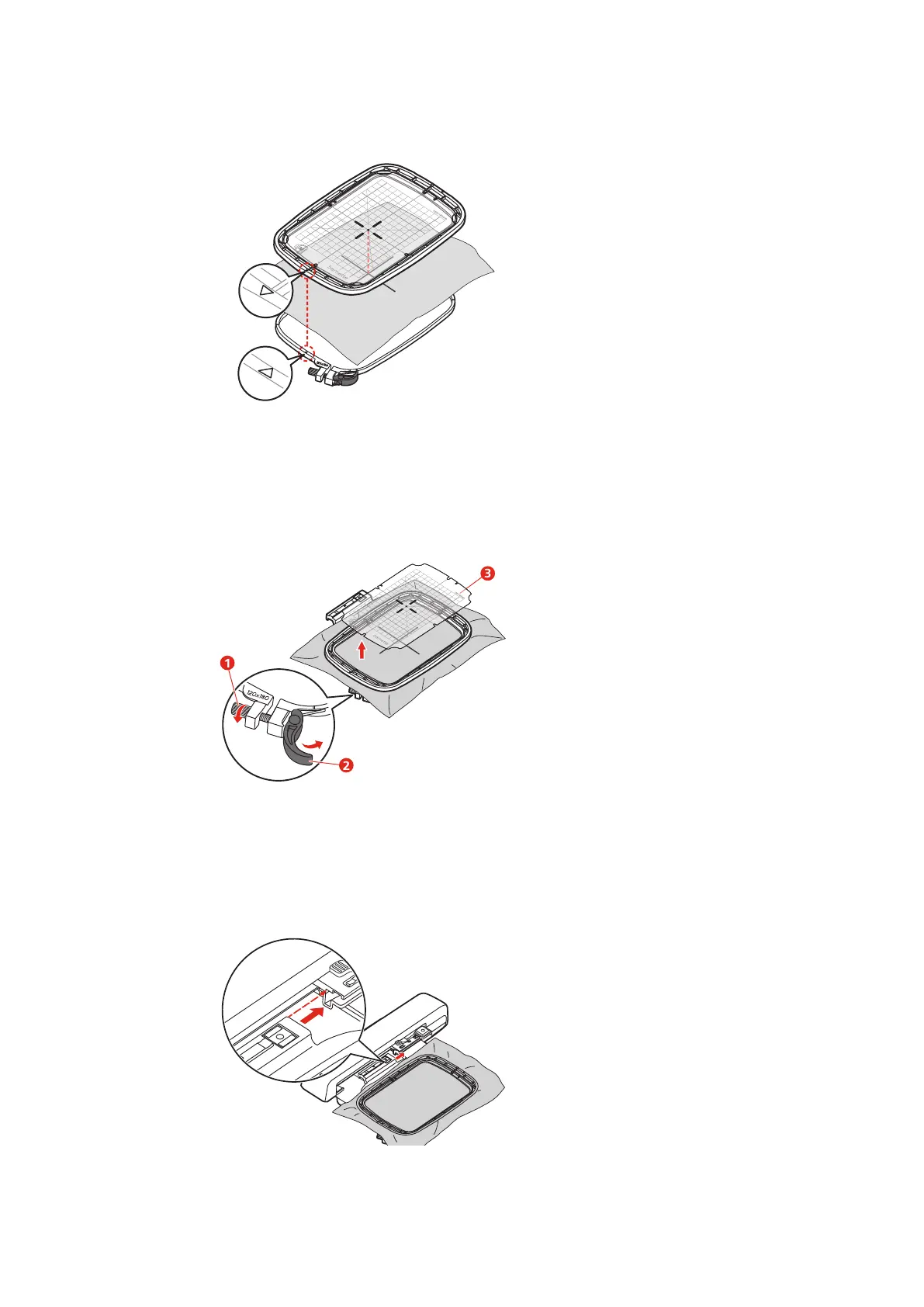 > Place the material and the inner hoop on the outer hoop so that the arrows of both hoops match.