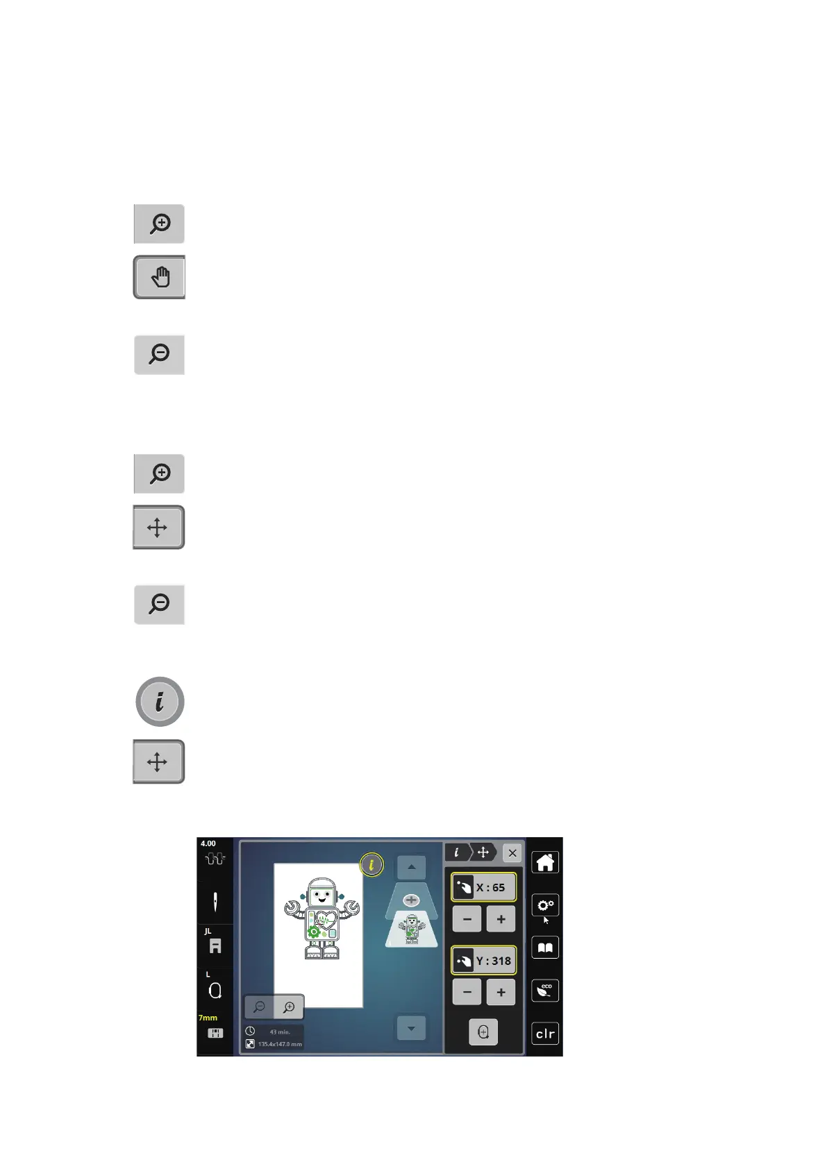 – Touch the icon «Zoom out» again to return to previous view.The embroidery position is not altered.