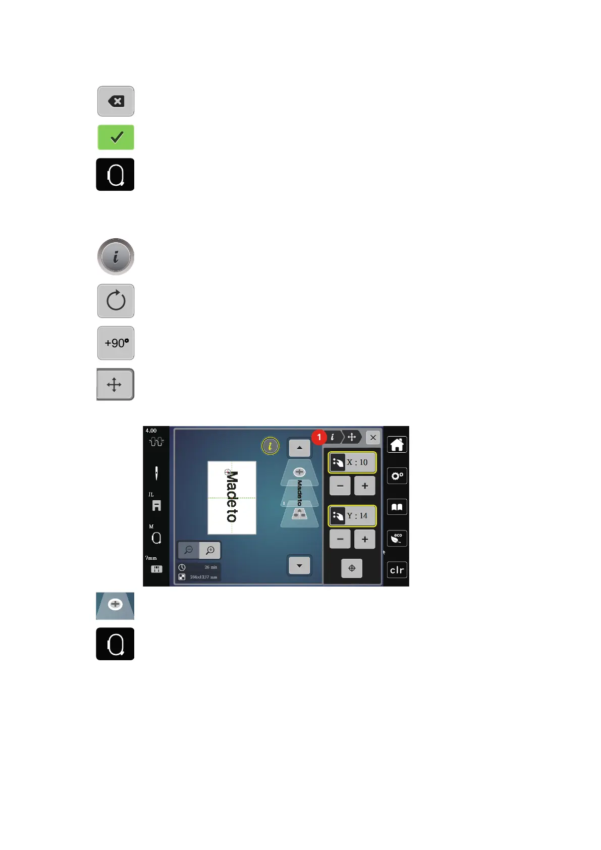 > Turn the Lower Multifunction knob or touch the «+»/«-» icon to move the embroidery motif vertically.