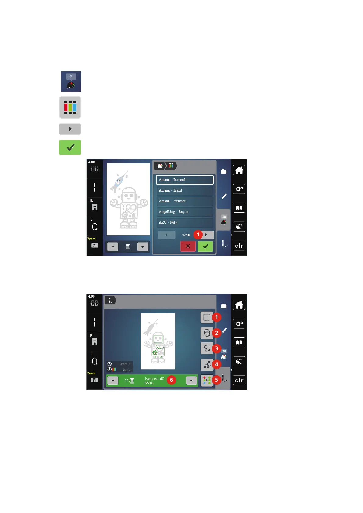 > Touch the icon «Scrolling» (1) to have further thread brands displayed.