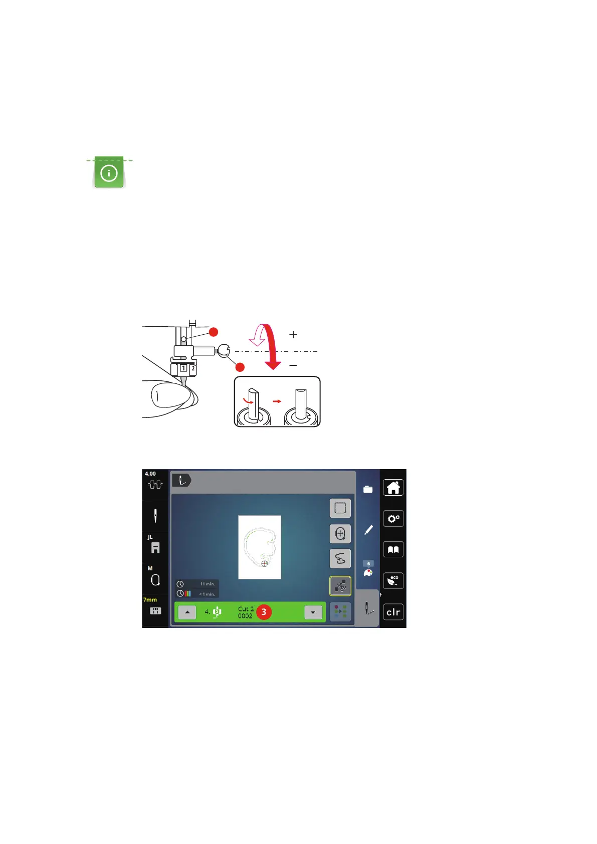 > Insert the CutWork Tool with the flat side back, fully up to the top (1). Tighten the needle clamp screw