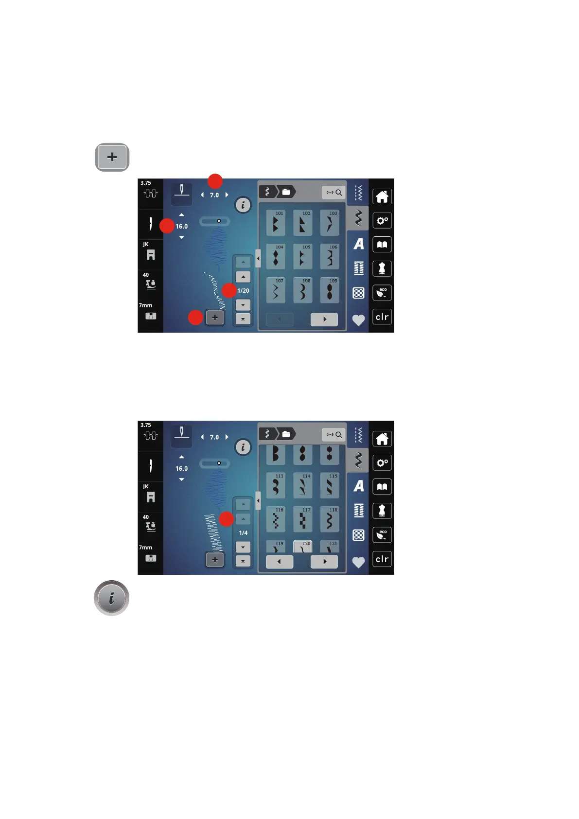 > Touch the icon «i»-Dialog to edit the single stitch pattern.