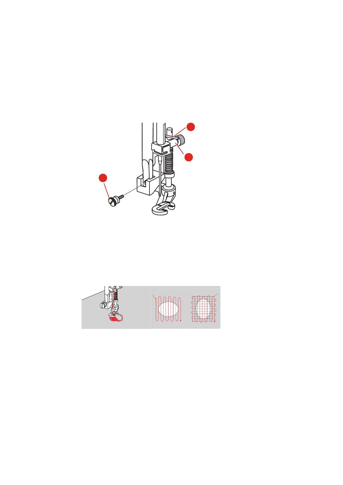 – The pin (1) of the Darning-/Embroidery foot should lay on the top of the needle clamp screw (2).