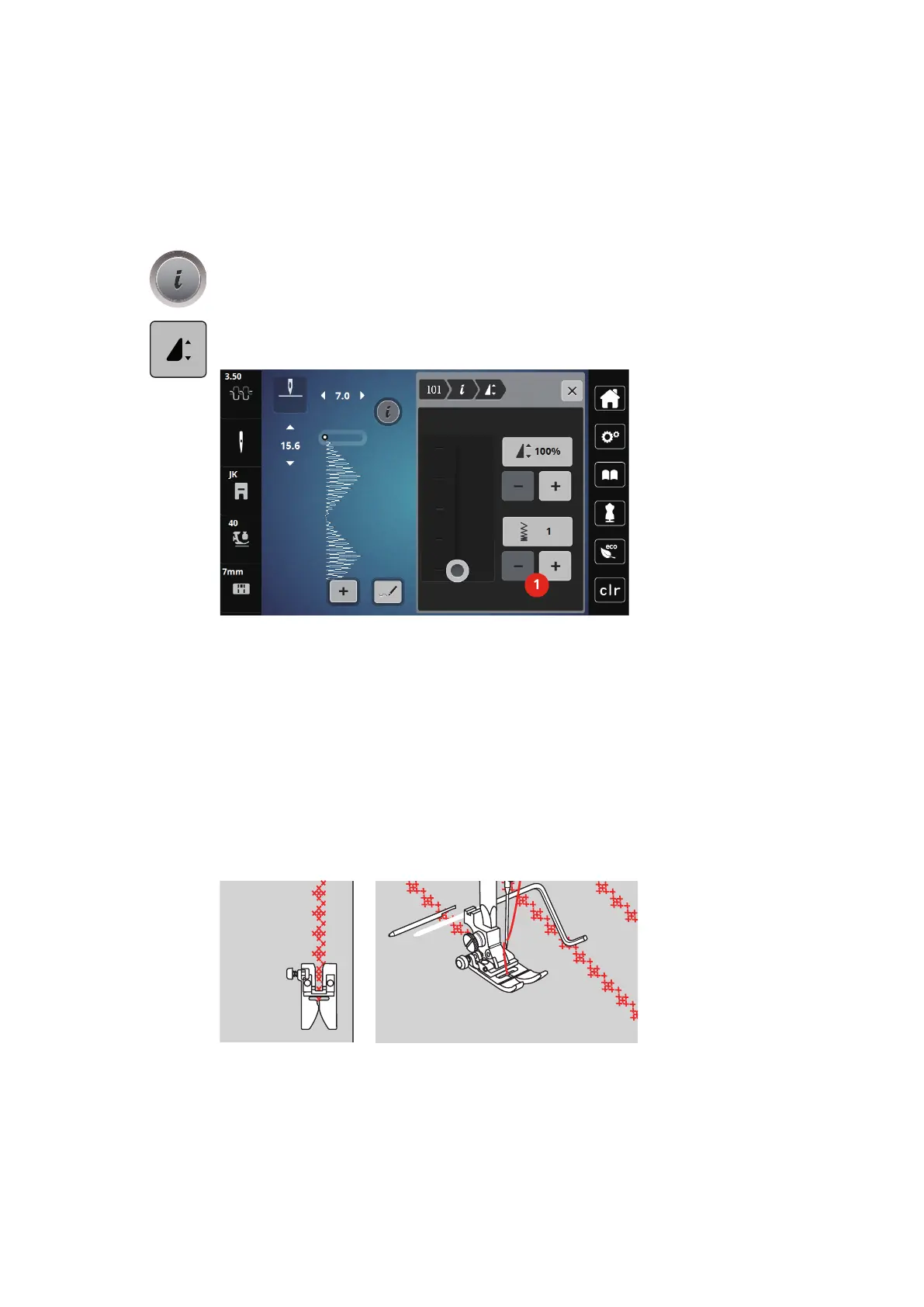 > Adjust the stitch density via the icons (1) «-» or «+».