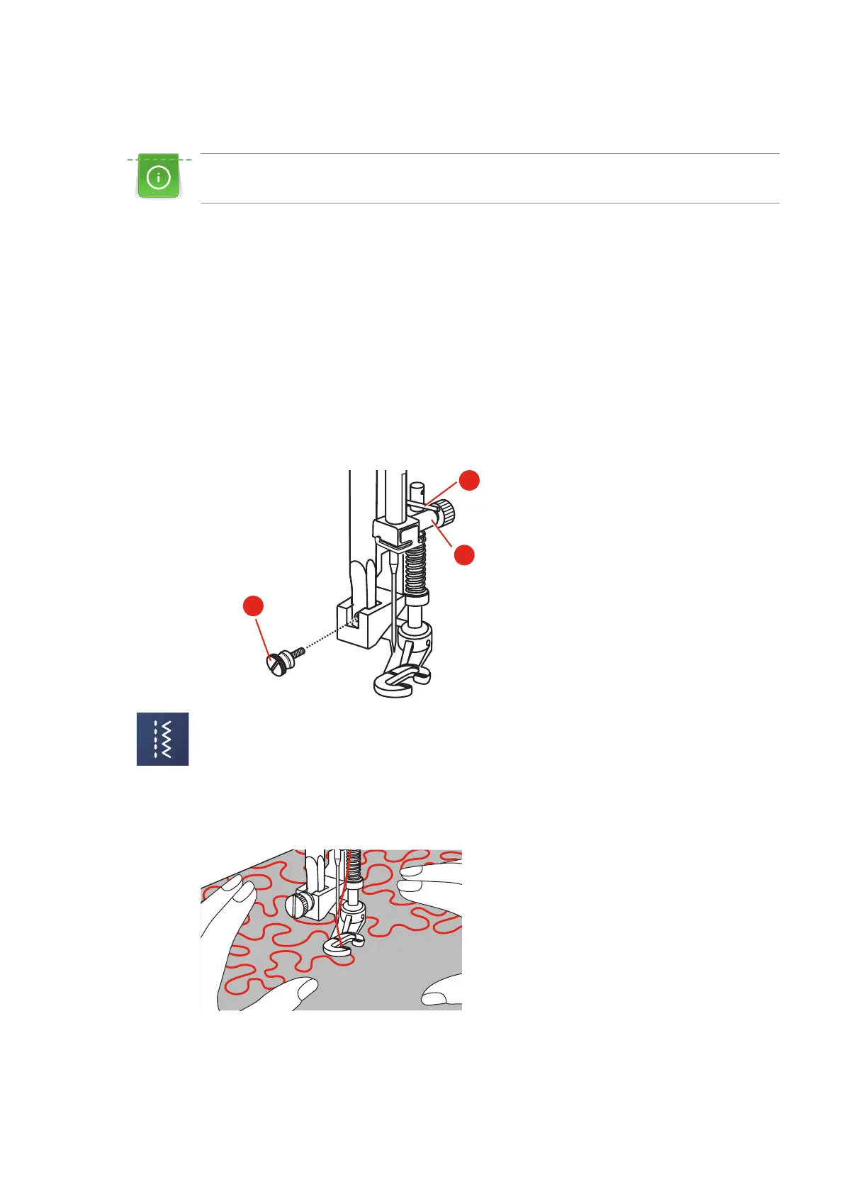 > Press the free-motion foot on firmly from below with your index finger and tighten the screw (3).