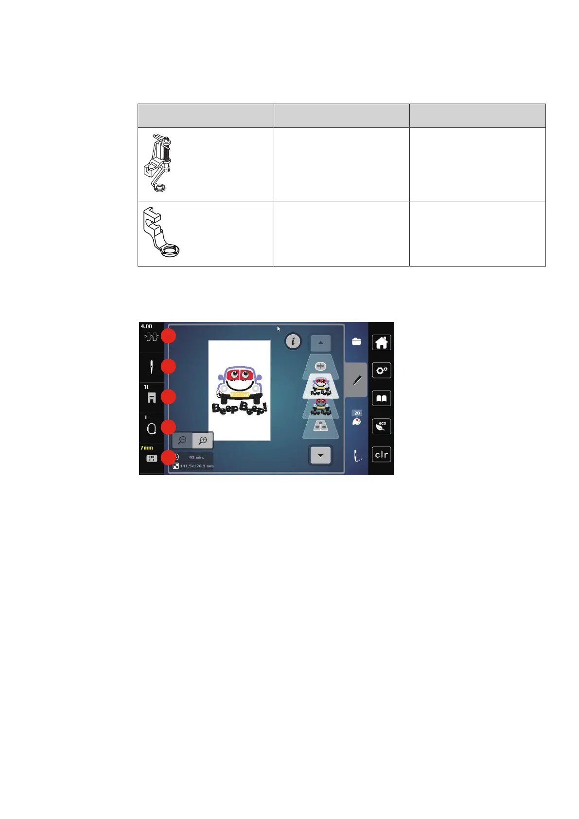 1 Upper thread tension 4 Embroidery hoop display/Embroidery hoop