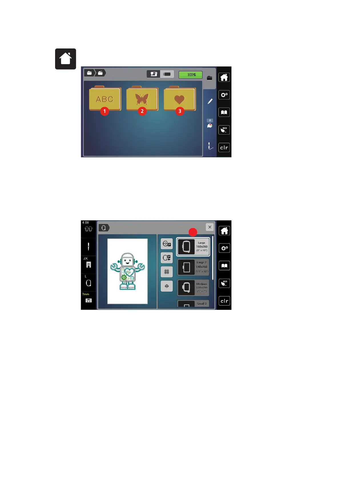 > Select an alphabet, embroidery design or a personal embroidery design from one of the files.