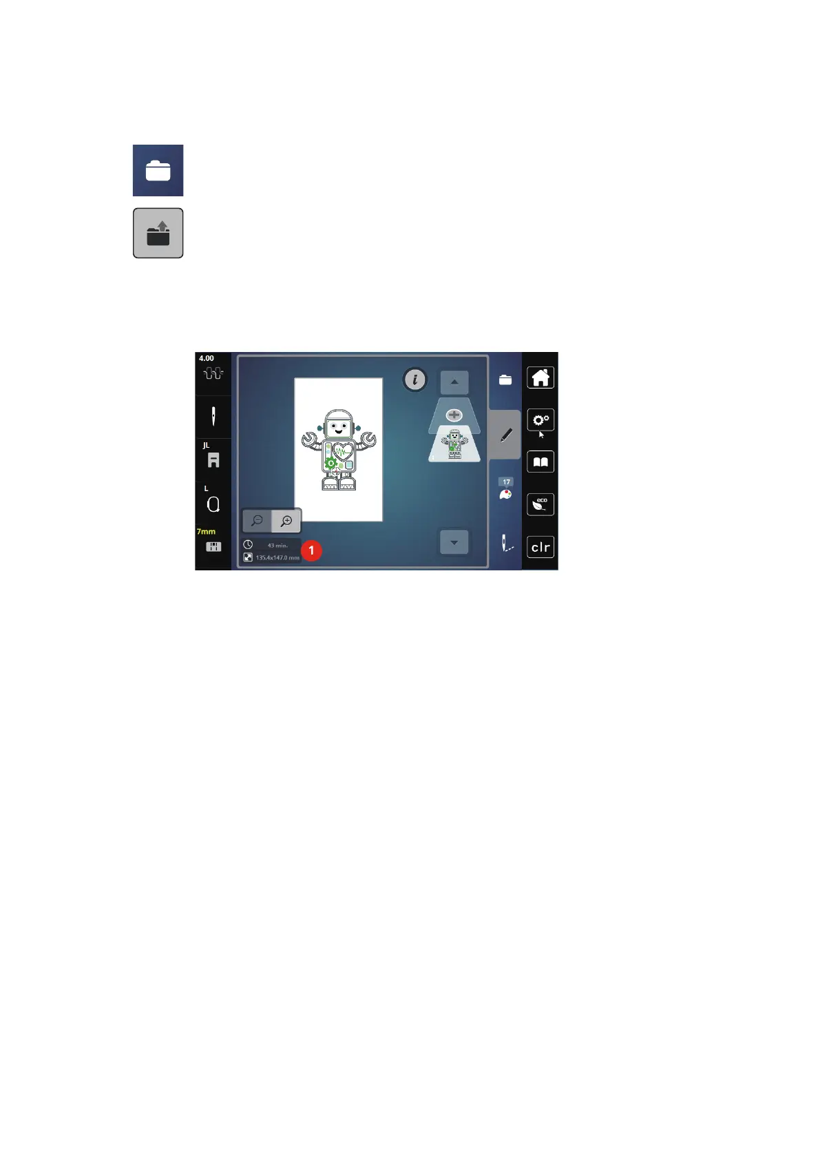In the selection menu «Edit» the estimated embroidery time in minutes as well as the width and height of
