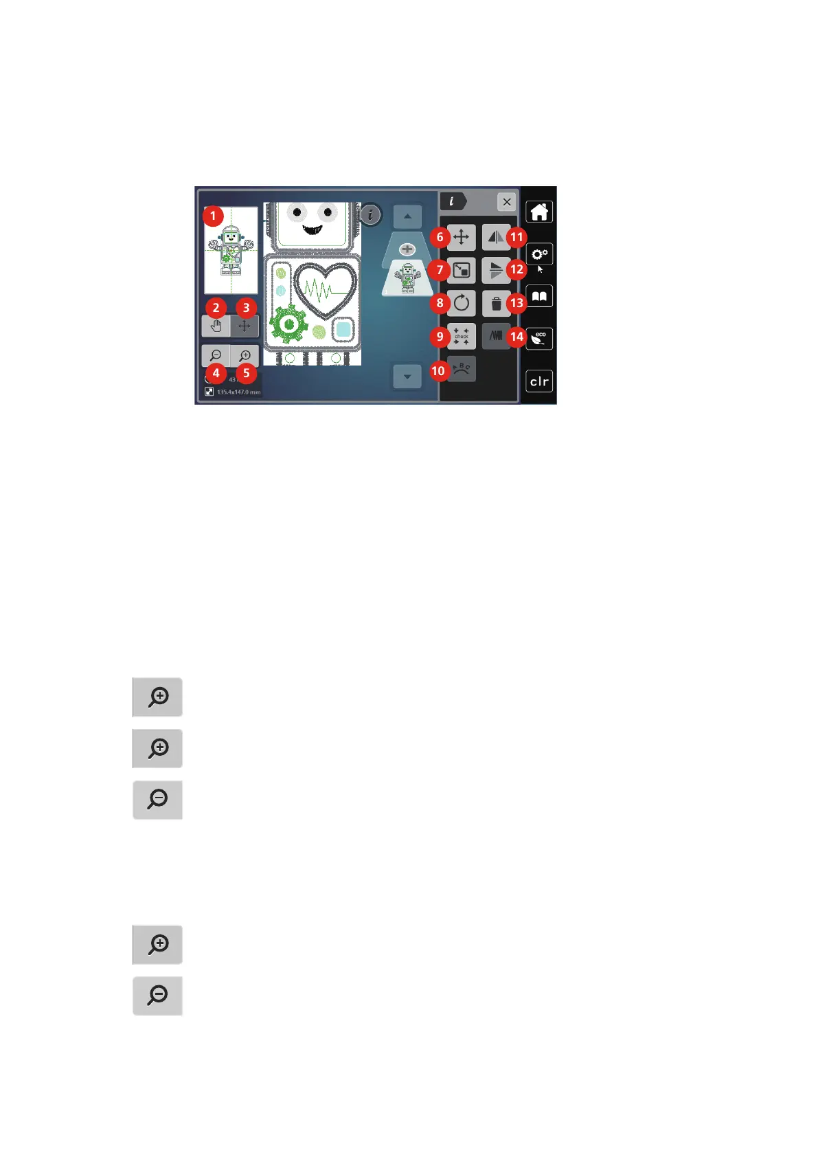 > To increase the embroidery design view by one level each time, tap «Zoom In» oneto nine times.