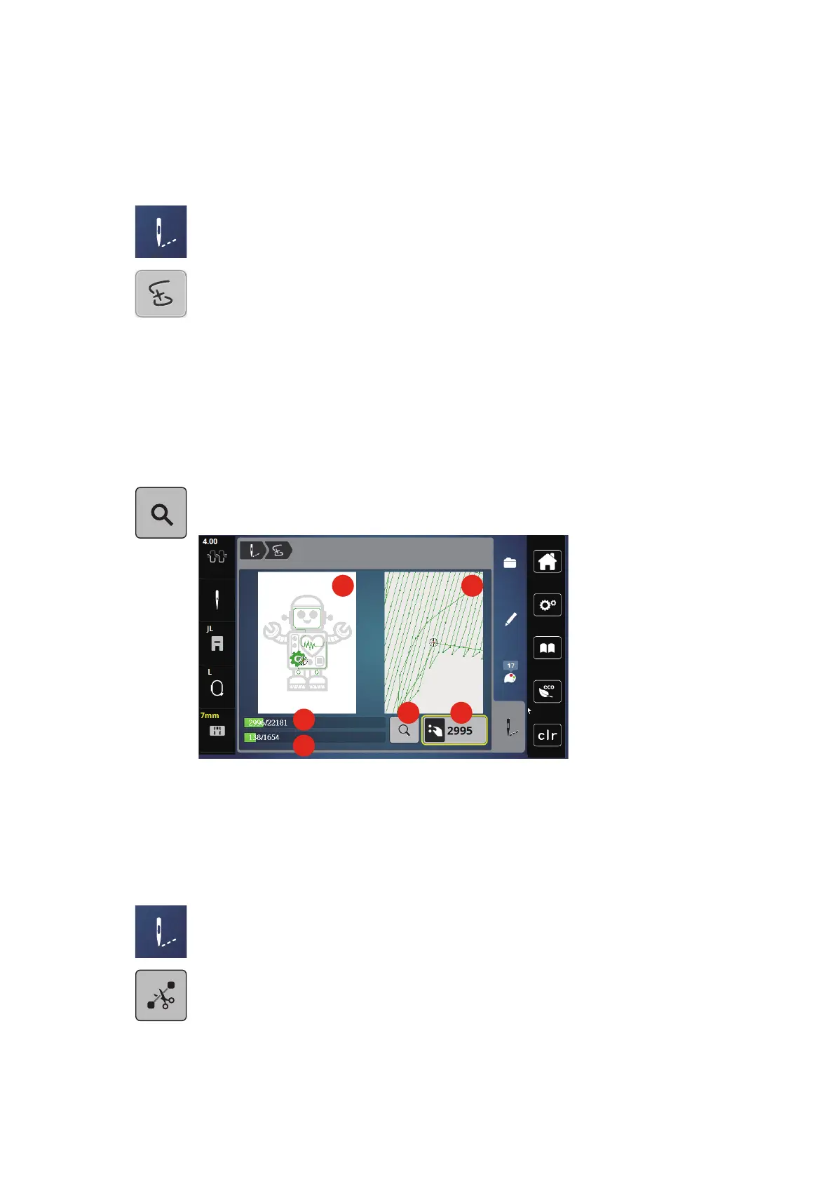 – The number in the yellow-framed icon (5) indicates the number of stitches of the embroidery process.