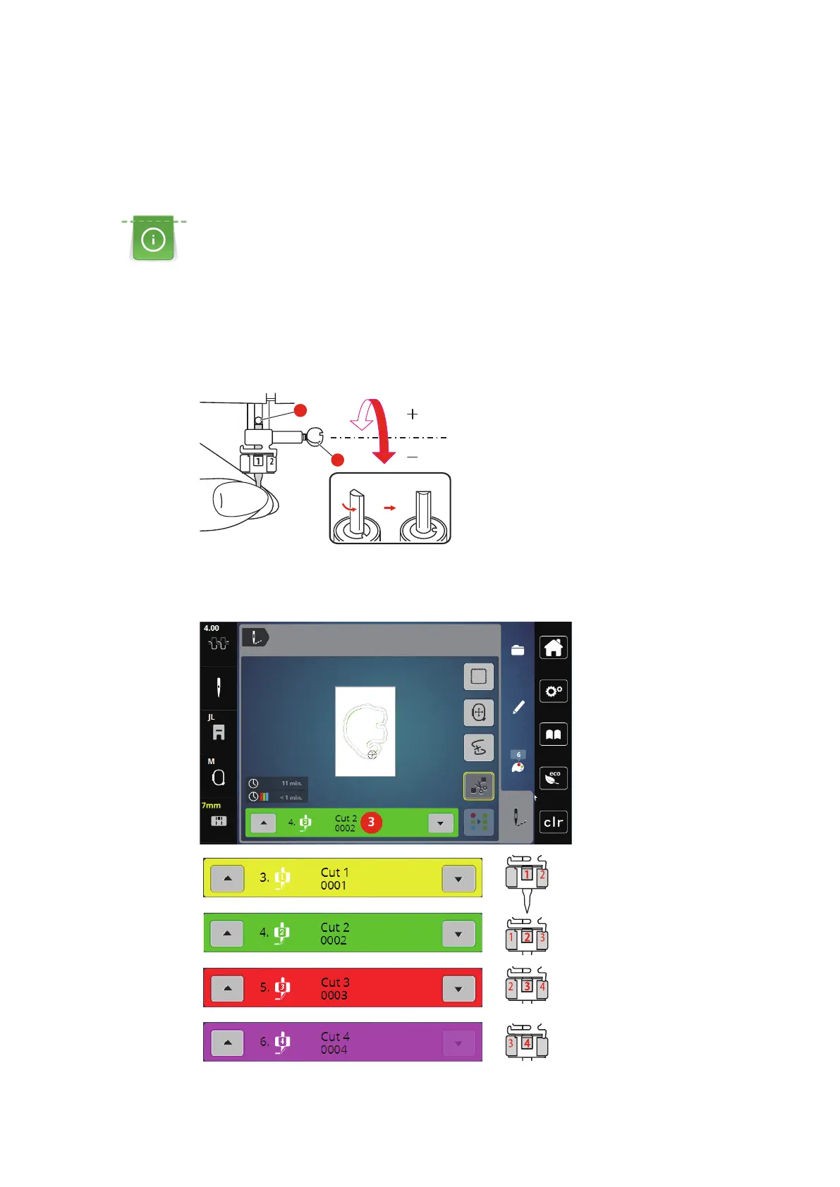 In CutWork Mode, the upper thread, bobbin thread and thread cut sensor are deactivated.