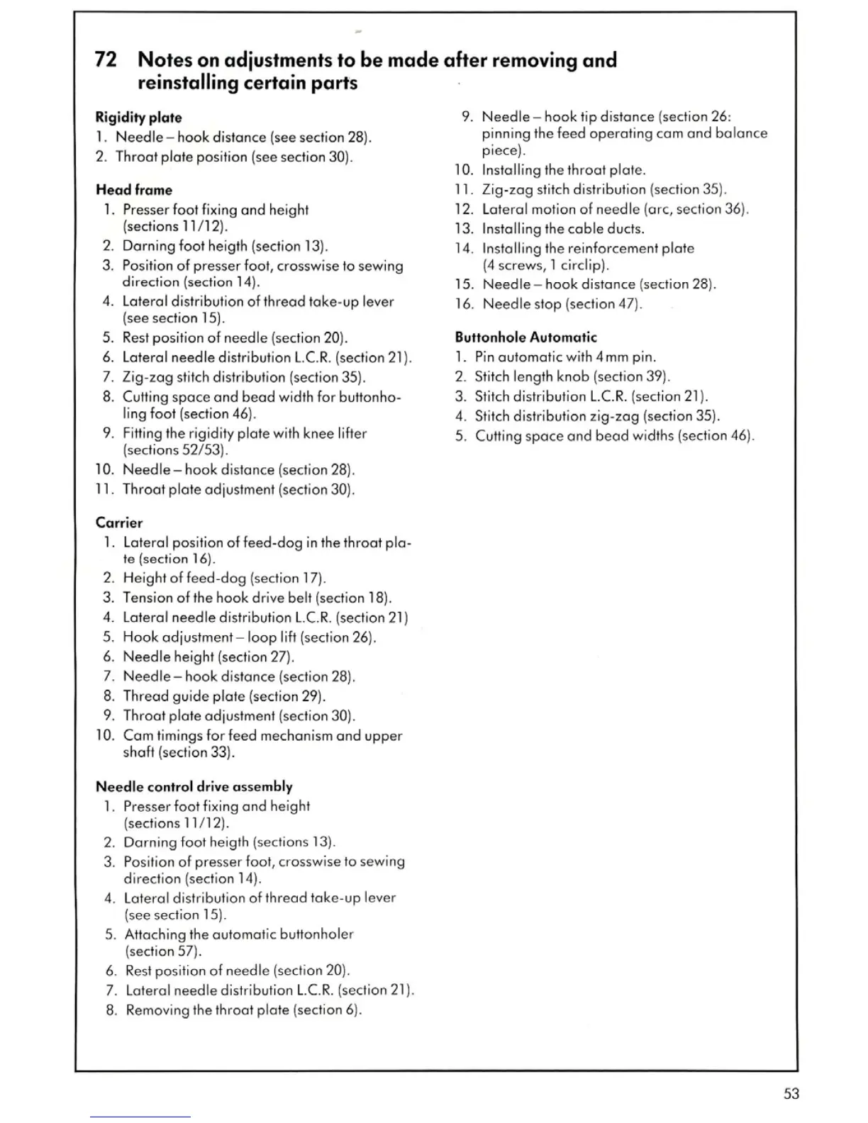 Bernina 1000 - Notes on Adjustments to be Made after Removing and Reinstalling Certain Parts