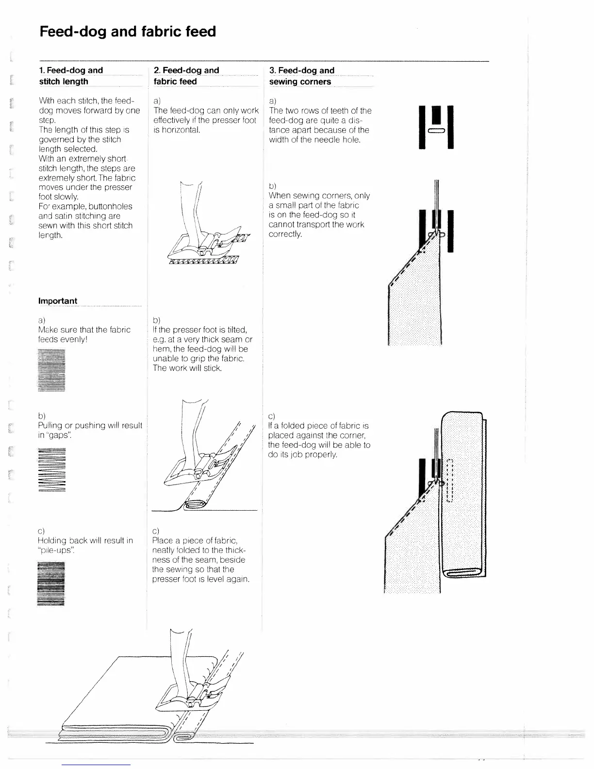 Bernina 1001 - Feed-Dog and Fabric Feed Mechanics; Feed-Dog Action and Stitch Length; Ensuring Effective Fabric Feed; Fabric Feed on Corners and Tips