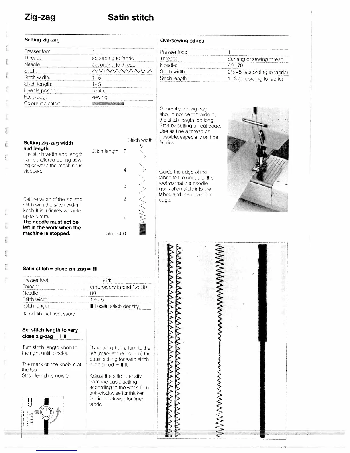 Bernina 1001 - Zig-zag, Satin, and Oversewing Stitches; Setting Zig-zag Width, Length, and Oversewing; Satin Stitch Configuration