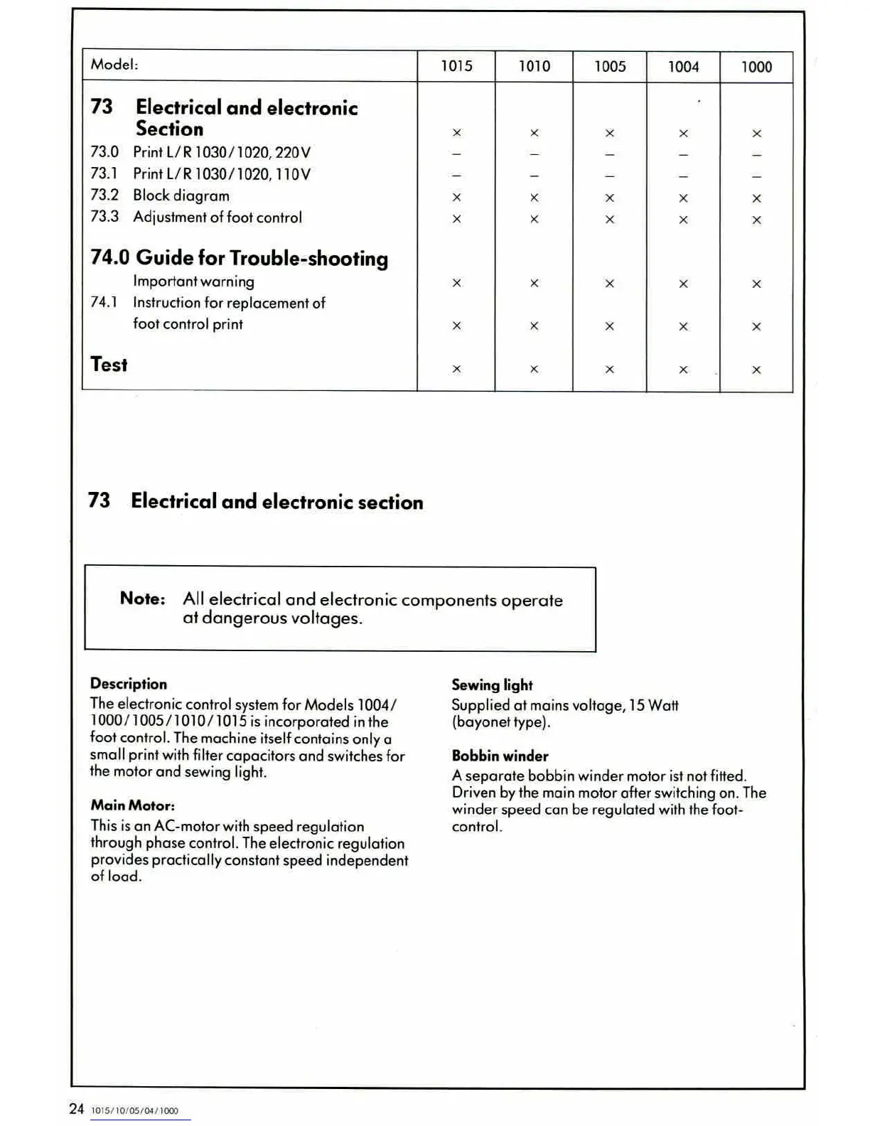 Bernina 1015 - Electrical and Electronic Section Table; Guide for Troubleshooting