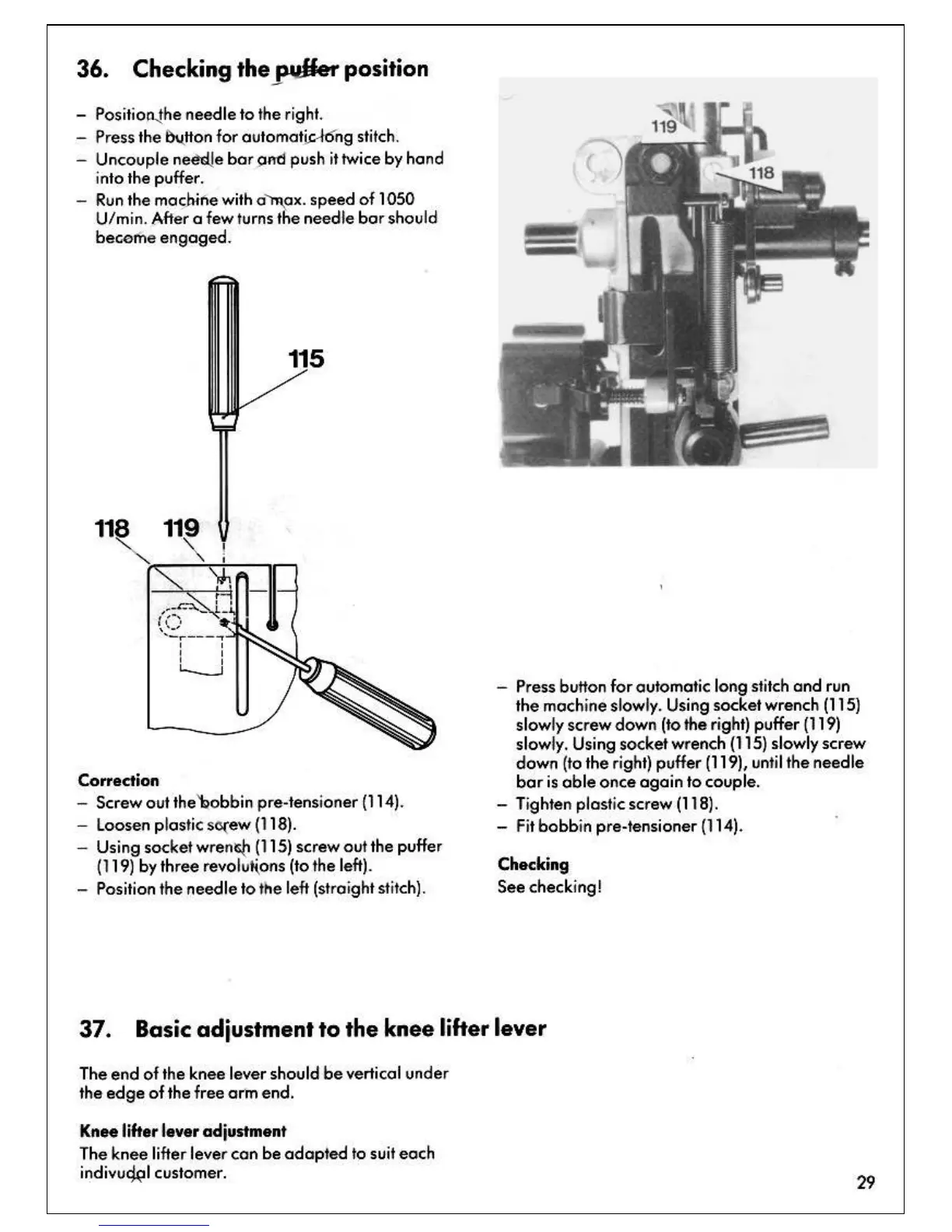 Bernina 1130 - Checking the Puffer Position; Basic Adjustment to the Knee Lifter Lever