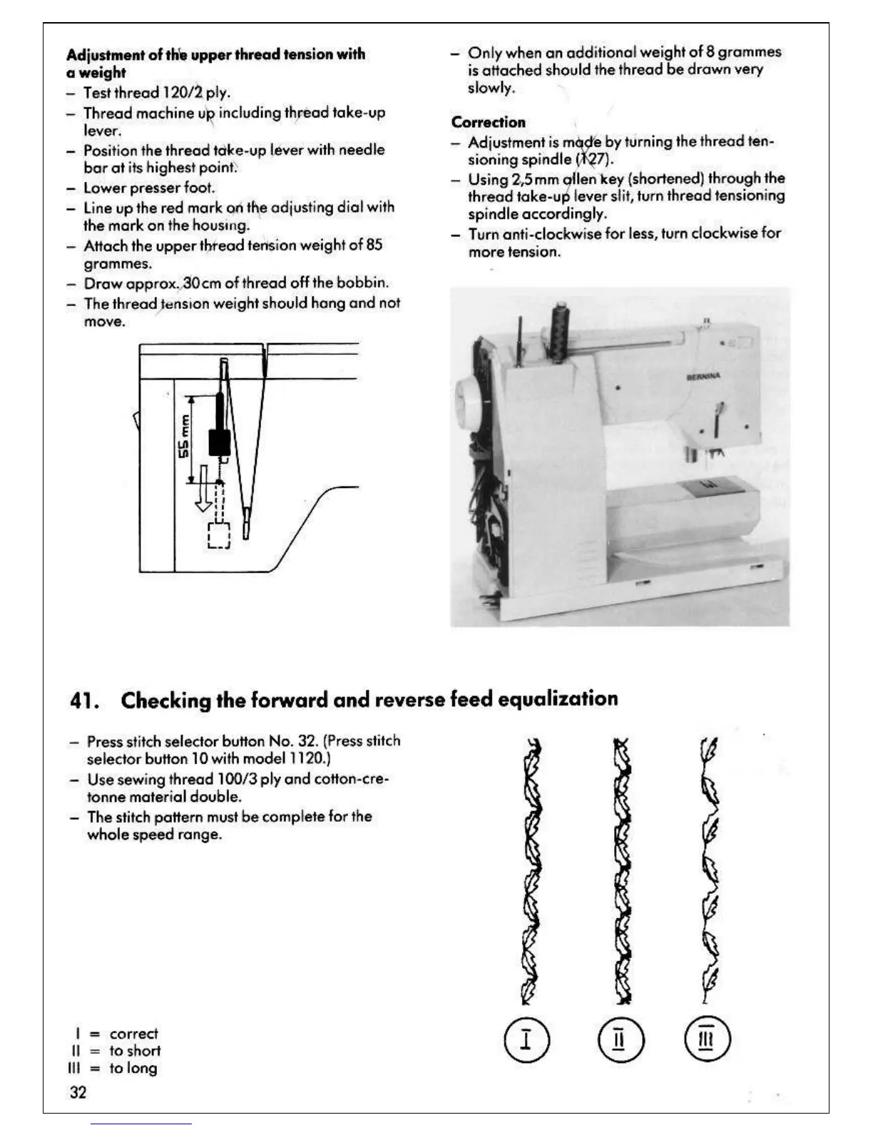 Bernina 1130 - Forward and Reverse Feed Equalization; Upper Thread Tension Adjustment with Weight; Upper Thread Tension Weight Correction; Feed Equalization Correction