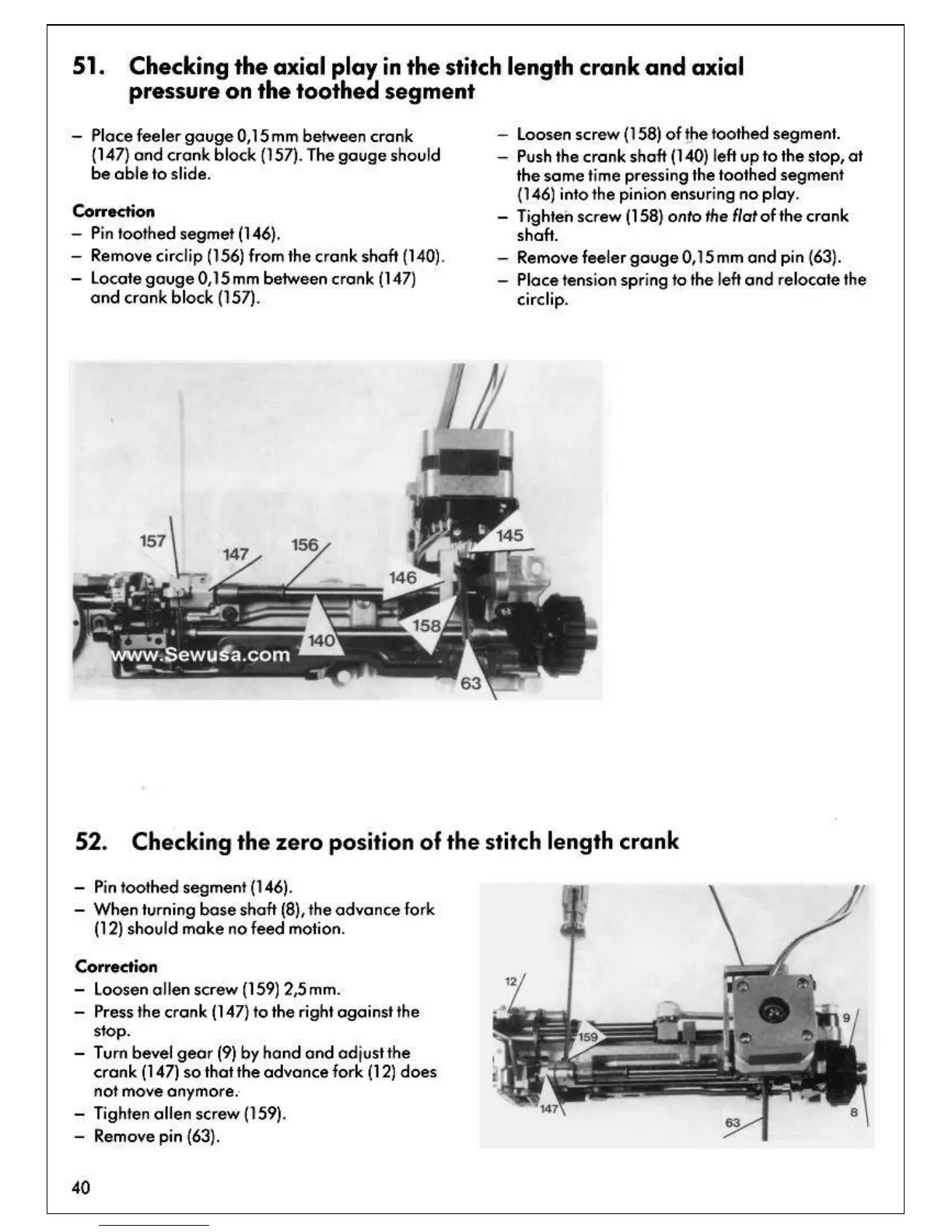 Bernina 1130 - Axial Play in Stitch Length Crank and Toothed Segment; Axial Play Correction; Zero Position of Stitch Length Crank; Zero Position Crank Correction
