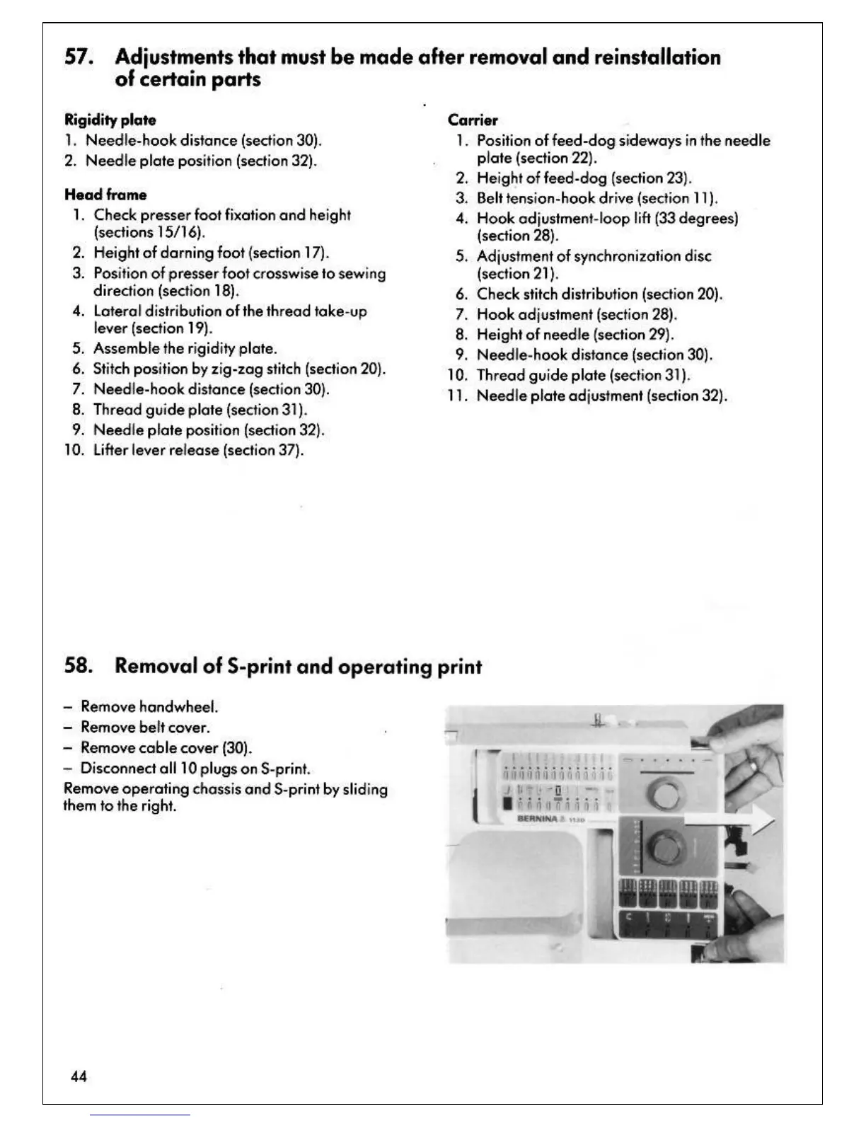 Bernina 1130 - Post-Disassembly Adjustments; Rigidity Plate Post-Adjustment Checks; Head Frame Post-Adjustment Checks; Carrier Post-Adjustment Checks