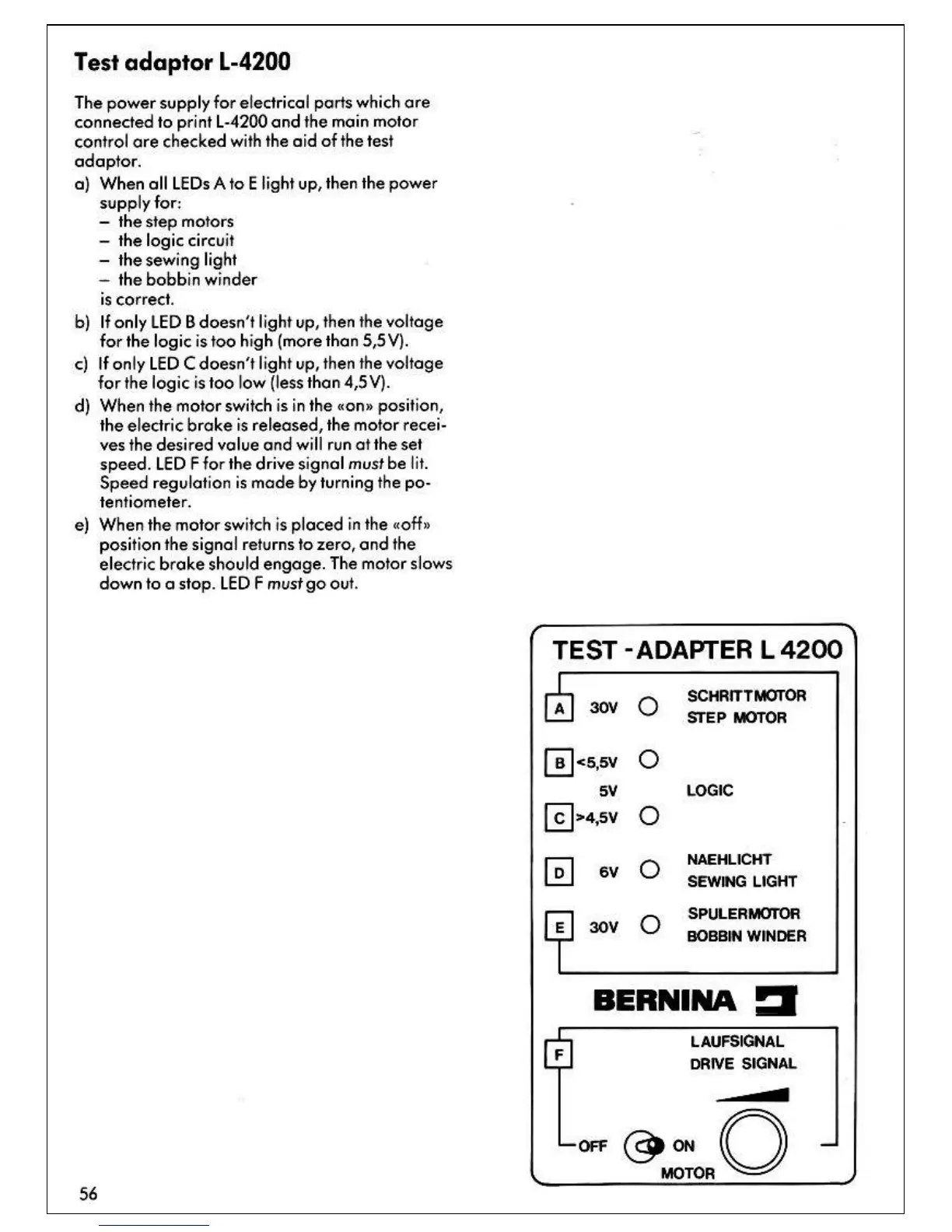 Bernina 1130 - Test Adapter L-4200 Operation; Test Adapter LED Indicators (A-E); Test Adapter Logic Voltage Check (LED B); Test Adapter Logic Voltage Check (LED C)