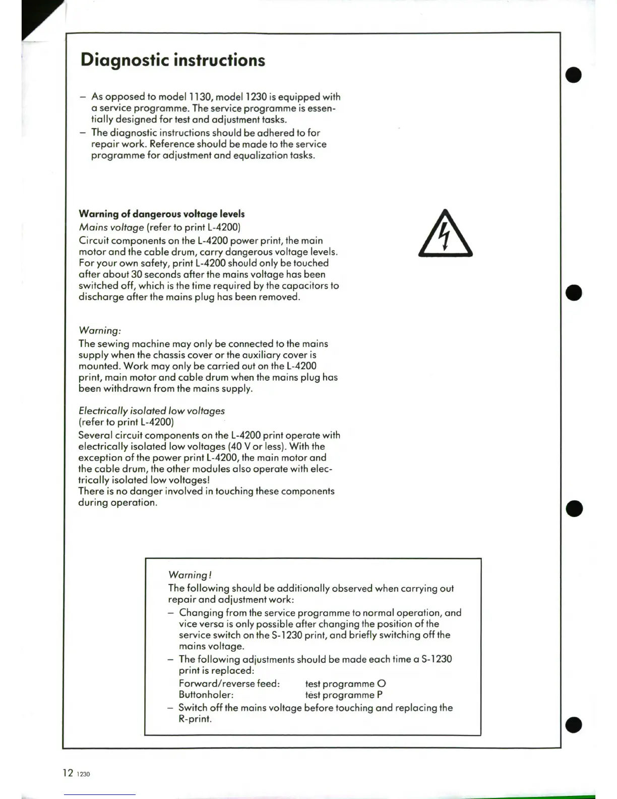 Bernina 1230 - Diagnostic Instructions; Voltage Warnings and Safety Precautions