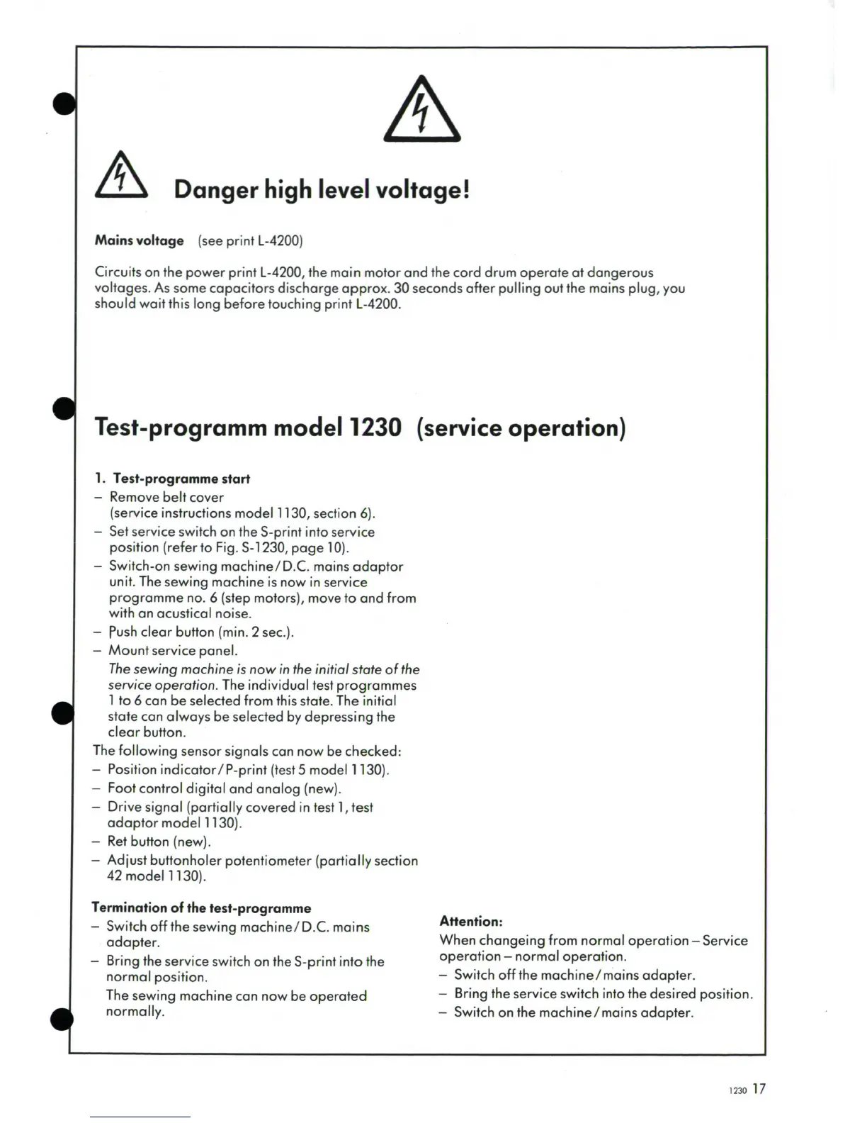 Bernina 1230 - Service Operation Test Procedure; Starting and Ending Service Tests
