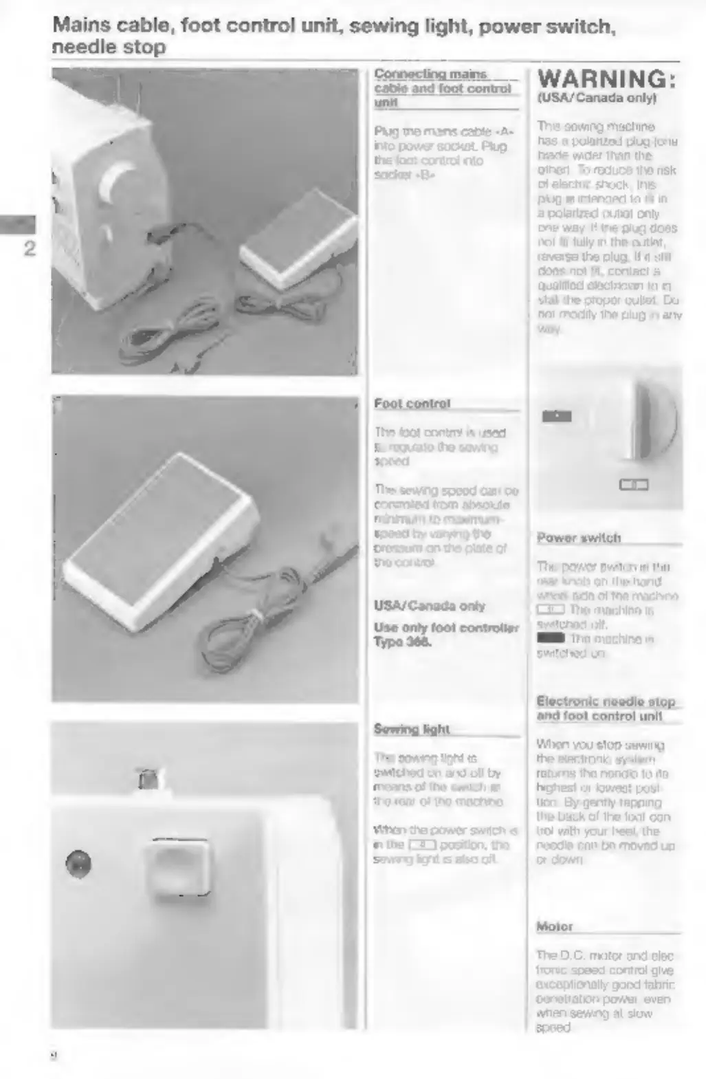 Bernina 1260 - Mains Cable, Foot Control, and Power Components; USA;Canada Plug Safety Warning